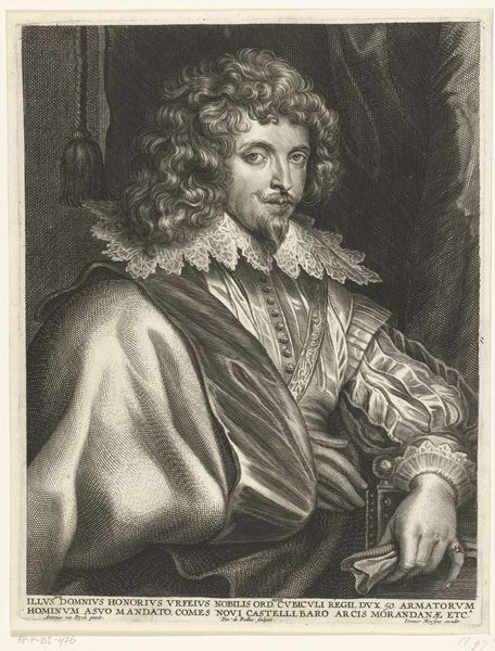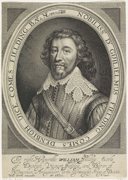 Curator: Here we have Pieter van Schuppen's 1699 engraving, "Portret van de Franse schrijver Honoré D'Urfé," a striking portrayal held within the Rijksmuseum collection. Editor: What hits me immediately is the man's face—a little fox-like, wouldn't you say? Sharp eyes, a hint of amusement playing around the lips… It’s a face made for stories, for intrigues, perhaps even for a little mischief. Curator: Van Schuppen certainly captured a sense of character. Look at the elaborate details, particularly in the lace collar and the cascading curls. The precision of the engraving brings a tactile quality to the fabric and hair. Editor: Absolutely! The oval frame gives the portrait an intimate, almost jewel-like quality. It's like peeking into a secret world. Plus, below the portrait itself, that little heraldic shield adds an interesting layer. Curator: It speaks to Honoré D'Urfé's noble lineage. These emblems served as visual reminders of family history and status. Think of them as an early form of branding. Editor: Branding! I love that. It's fascinating how we still use these kinds of symbols today to convey similar ideas. Though nowadays we might just use Instagram filters, then a meticulously crafted coat of arms to suggest old money and power. Curator: Exactly! And you can see that level of care echoed in Van Schuppen's technique. The way he manipulates light and shadow creates a palpable sense of depth and volume. Intaglio printing has that certain air that stands out through centuries. Editor: It is impressive, like a captured breath from a past century. Looking at this portrait reminds me how powerful visual storytelling has always been in shaping our perceptions of people and history. Curator: Indeed, this image, etched in ink, offers a fleeting connection across time, a silent conversation between us and the era that birthed it. Editor: A beautifully concise thought!
