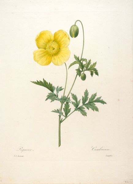 François Langlois, called Ciartres, created "Rosier Eglantier" using watercolor and graphite. The plant's stem rises, adorned with thorns, supporting lush green leaves and vibrant yellow roses. The leaves present a diverse palette of greens, from darker hues to softer, almost greyish tones, creating a complex interplay of light and shadow. Langlois masterfully uses color and form to communicate the essence of the plant. The composition, with its careful arrangement of elements, reflects a deep understanding of botanical structure and the aesthetic principles of the time. Consider how the semiotic system, informed by botanical science and artistic expression, serves to capture the plant’s identity. This artwork invites us to reflect on the delicate balance between natural observation and artistic interpretation, offering a new perspective on the way we perceive and classify the natural world.