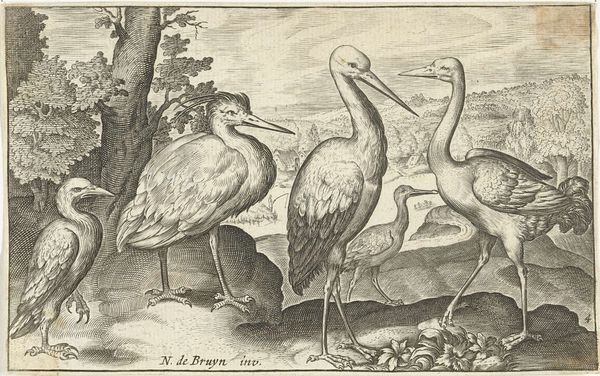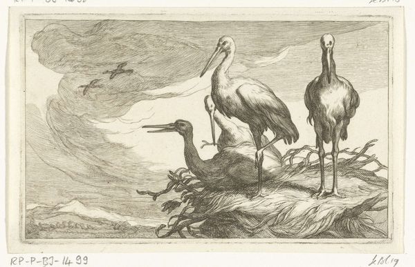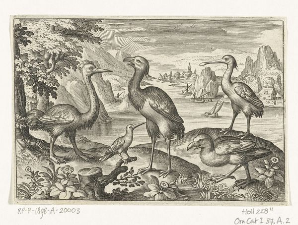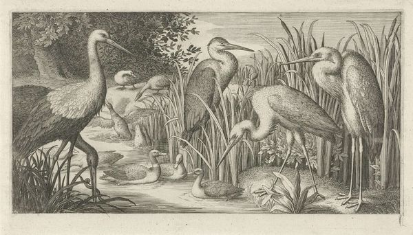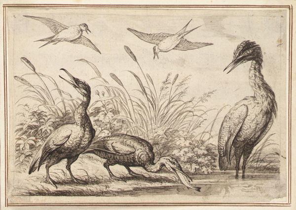 Curator: Ah yes, Wenceslaus Hollar's "Watervogels," created in 1654. What strikes you about it? Editor: I find it quite fascinating. It's an etching, quite detailed, showing several water birds in a landscape. The one holding a fish seems so comical somehow. How do you interpret this work? Curator: For me, it's essential to consider the materials and techniques involved in Hollar's process. Etching allowed for relatively easy reproduction, and the prints could circulate widely. We must ask, who was Hollar producing these images *for*? The emerging merchant class in the Dutch Golden Age valued depictions of the natural world. Editor: So, it's less about artistic expression and more about a commodity made for a specific market? Curator: Precisely! The *means* of production dictated the kind of image created and for whom. Consider, too, how prints like these disseminated knowledge about different species and their habitats. Was it a tool for scientific observation or more about establishing a status symbol, pointing to global trade? Editor: I see your point. By considering the material conditions – the printmaking technique, the social context, and the target audience – we can gain a much deeper appreciation for the work. Curator: Indeed. And we also begin to challenge these assumptions by thinking about the labor involved in Hollar's etching, how materials were sourced and then circulated and consumed across different audiences. What do you think is gained or lost from that kind of approach? Editor: I guess it shows us how art is always intertwined with production, society, and even the labor force behind it. Thanks for sharing this perspective.