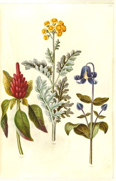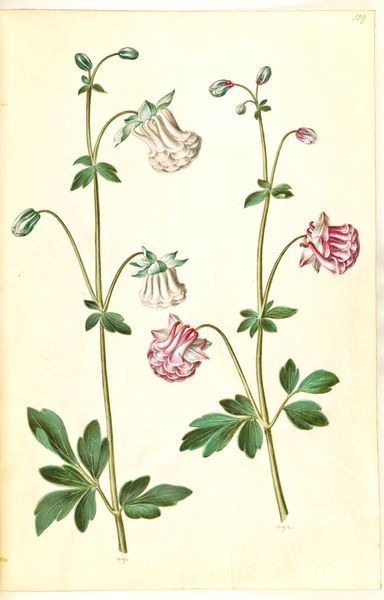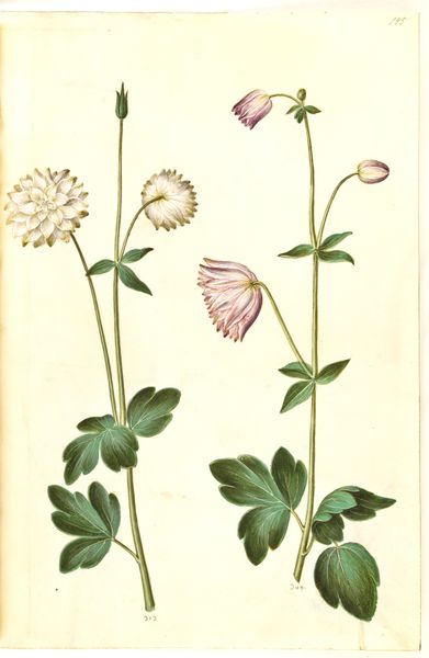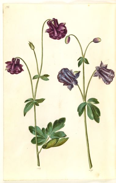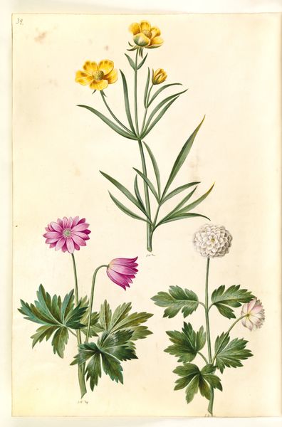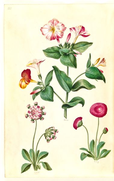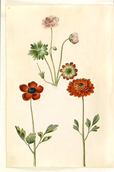 Curator: So, here we have "Helleborus niger (almindelig julerose); Eranthis hyemalis (have-erantis); Gagea lutea (almindelig guldstjerne)", created sometime between 1635 and 1664. The artist was Hans Simon Holtzbecker, and it’s made using drawing and gouache. Editor: Right off the bat, I get a feeling of serene observation, like stepping into a hidden corner of a Renaissance garden. There’s something so gentle and precise in the way each flower is captured. Curator: It's a gorgeous example of Northern Renaissance botanical art. We have to remember that in the 17th century, accurate botanical illustrations weren't just beautiful; they were crucial for scientific understanding and, indeed, for burgeoning pharmaceutical knowledge. Holtzbecker wasn't just painting pretty pictures; he was contributing to a wider project of cataloging and understanding the natural world, often tied to colonial ventures and the exploitation of nature. Editor: Ah, the dualities! Beauty masking knowledge-seeking and a subtle connection to broader systems of power. You can almost feel the artist's careful breath as he renders each delicate petal. What's particularly interesting is the composition. The artist isolates each specimen against a blank background. What does that stylistic choice communicate? Curator: Good question. Isolating the flowers encourages a focused study. There's an implicit emphasis on pure observation. Stripped of any context, the forms speak directly to a kind of ideal specimen for the interested doctors and apothecaries of the time. Editor: Exactly! There is something deeply peaceful about the rendering of light and shadow on the petals. For me, this connects to broader conversations in art, gender and how historical practices are viewed differently depending on one's location and historical moment. Curator: It speaks to a desire for a pristine, almost clinical, observation that is also embedded within wider power structures of resource allocation in the Renaissance period. Thank you for joining us for this exploration. Editor: I walk away feeling grateful for the tiny universes blooming on paper—an encounter both gentle and quietly charged.