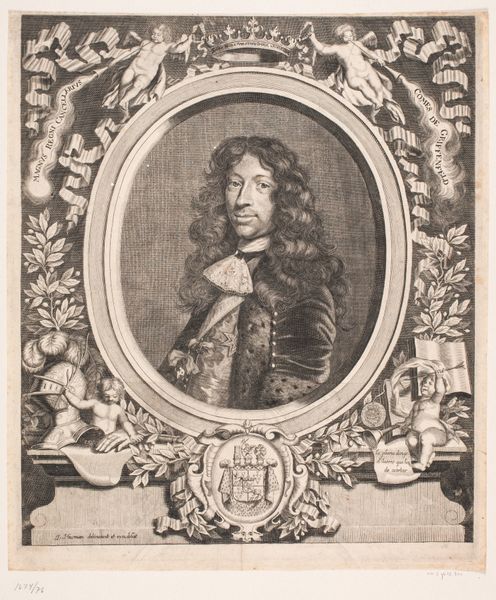 Curator: Before us, we have an engraving titled "Johan Christoph von Körbitz" crafted between 1664 and 1670 by Albert Haelwegh. The artwork, currently housed in SMK—Statens Museum for Kunst, offers a compelling example of Baroque portraiture in print form. Editor: My first impression is... imposing! The sitter's expression, the swirling lines of the engraving—it all lends a gravity, a certain... weightiness to the image. Like peering into the past and feeling its seriousness. Curator: The meticulous detail achieved through engraving contributes significantly to this effect. Note the intricacy of the lines that delineate not just his features but also the textures of his clothing and hair. The lettering is also very important for the composition. Editor: Absolutely. Look at that lace at his throat! Each tiny frill meticulously rendered. It’s amazing how typography almost becomes another element that defines his nobility and elevated rank. Gives me a sense of the sitter’s self-importance and also reminds us of the function of this image within that time period. Curator: The use of oval frame containing the portrait emphasizes a formal separation and elevates him into an esteemed sphere. Note the detailed calligraphy, almost hidden on the bottom, a classic Baroque element to reinforce status, honor, and genealogy. The lines and letters convey symbolic and societal nuances through its artistic qualities. Editor: Exactly! It’s more than just a pretty picture. There’s this performative aspect to it, wouldn’t you say? An individual wanting to establish his existence, but in the most artistic and elaborate manner. Curator: The columned text adds another layer. The deliberate layout serves both an aesthetic and an informative function, embedding meaning and reinforcing the subject's identity through textual embellishments. The lines have an inherent weight; one gets a strong sense of what it might mean for posterity to reflect this person in this specific aesthetic way. Editor: Reflecting on it all now, the image strikes me as a study in controlled presentation. A reminder of how portraits were—and perhaps still are—instruments for crafting and perpetuating an ideal image. Curator: I concur. The synthesis of meticulous engraving and stylized Baroque aesthetics constructs a powerful, enduring representation.