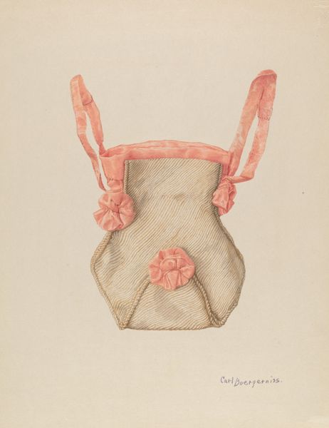 Editor: This is Jessie M. Benge's "Bonnet" from around 1937. It looks to be rendered with pencil, watercolor, and charcoal on paper. It has this quiet, almost dreamlike quality to it. What do you see in this piece, beyond just… a bonnet? Curator: Oh, it's utterly charming, isn't it? It whispers of forgotten elegance, like a relic unearthed from a grandmother’s attic. Notice the detail, though; that ribbon with its delicate lace edge. There's such an attention to capturing texture, almost tactile. Does it evoke any specific era for you? Editor: It feels almost Victorian, maybe very early 20th century? The bonnets you see in old portraits... There's a real sense of gentility. Curator: Precisely. It’s interesting to consider that while the object itself is demure, the act of rendering it – spending so much time focused on its intricate details – feels rather bold. What do you make of the colours? Editor: They’re so soft, muted, almost faded. That pale pink is quite striking. Curator: And somehow melancholic, wouldn't you say? Almost as though the artist captured not just the bonnet itself, but the memory of it. It makes me wonder about the person who wore it, the life it represents. I picture picnics and summer afternoons. Maybe the painting's quietness speaks volumes. Editor: I agree. The artist really captured the spirit of the accessory rather than its physical reality. Thanks, that really gave me a fresh appreciation for the work. Curator: My pleasure! Art, after all, is simply a shared whisper between the artist and the viewer. And today, you've become part of that beautiful exchange.