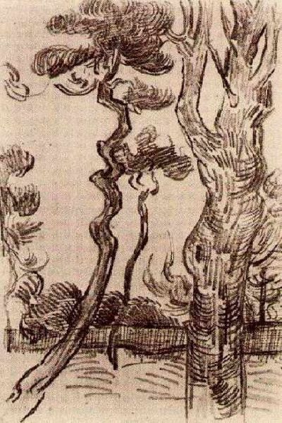 Editor: Here we have Vincent van Gogh's 1890 ink drawing, "Several Figures on a Road with Trees." The sketchiness lends a sort of transient, dreamlike quality to this gathering of people. How would you interpret the composition? Curator: The drawing is a study in contrasts. Observe how Van Gogh uses short, decisive strokes to delineate the figures, rendering them almost monumental, yet they are integrated into the landscape through the echoing patterns in the trees. Note also how line and composition establish meaning. Editor: Can you elaborate on that, about meaning? Curator: Consider the density of line in the lower register in the area occupied by the walking men versus the much sparser arrangement in the depiction of the distant boat, and ponder what is happening in the tonal value. Do these two elements compete or connect formally? Is there tension between the material weightiness in the one versus the light etherality in the other? How is meaning affected in the absence of one or the other of those relationships? Editor: So, you're seeing a deliberate contrast to possibly emphasize their relationship with the earth, while maybe the upper boat conveys freedom? Curator: Perhaps. More compelling for me is the rhythm the image carries from a pointillist sensibility. A consistent patterning and arrangement is pervasive; meaning is delivered through a structured visual grammar. Editor: It’s fascinating how looking closely at the line work and composition reveals new ways to appreciate the piece! Curator: Indeed. Attending to those relationships gives one an aesthetic grasp of the world.