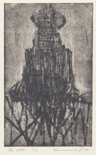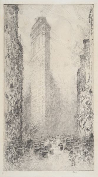 Curator: Look at this Joseph Pennell print from 1908. It's titled "The Flat Iron New York". The etching presents a rather ethereal view of the iconic building. Editor: My first impression is how ghostly it appears, shrouded in a kind of atmospheric haze. There is an interplay between stark verticals and almost imperceptible gradations. It's quite compelling. Curator: Yes, Pennell's use of etching emphasizes the geometric forms while subtly obscuring details. It brings a softness to the city’s modernity, doesn't it? Notice the vertical thrust, the limited but highly contrasted values, and the stark angles of the skyscraper, all elements that highlight the period's obsession with function and modernity. Editor: Indeed. I see the Flatiron Building itself standing as a kind of symbolic sentinel. Back then, skyscrapers like this represented not just architectural progress, but also a reach towards the heavens. They are declarations of ambition! The smokiness surrounding it evokes a sense of transience or maybe the price of progress and a nascent environmental awareness, even in 1908. Curator: I agree. By manipulating the etching process, Pennell diminishes crisp, photographic representation to suggest something more conceptual. We should consider how that flatness, that relative ambiguity, emphasizes a modern re-imagining of landscape itself. Editor: And how those figures at its base appear dwarfed. New York always evokes the dichotomy of human striving set against nature’s grand stage. This evokes the anxieties around that burgeoning power, while the Flatiron represented more than just architecture, it was hope for a new American century. Curator: Well, in my perspective, it’s more than the story; Pennell emphasizes compositional values, the visual impact of verticals against the landscape. It is less about aspiration than how to communicate aspiration through effective contrasts. Editor: An interesting counterpoint, thank you. The print is very evocative and allows room for interpretation. Curator: It is fascinating how a structured formalism creates diverse effects.