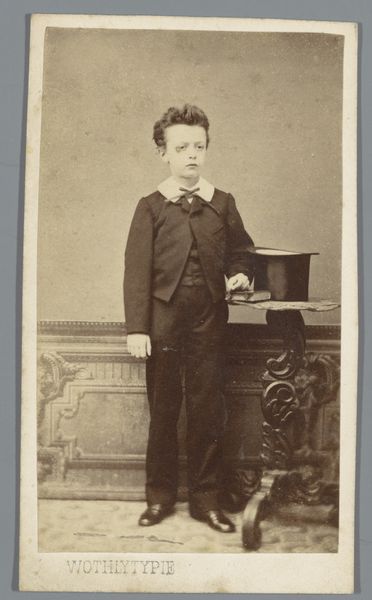 This is a photograph of a boy in a three-piece suit, made by Albert Greiner. The image presents us with an interesting view into the rigid social expectations of the time. This studio portrait, likely taken in the Netherlands, offers insight into the visual codes of class and status during the 19th century. The boy's formal attire, complete with a bow tie and waistcoat, speaks to the importance placed on appearance and the representation of social standing. The studio setting, with its draped curtain and ornate prop, further emphasizes the constructed nature of the image. By examining photographs like this within their historical context, we can better understand the complex interplay between individual identity and the social forces that shape it. Researching the history of photography, fashion, and social customs in the Netherlands during this period can provide a deeper understanding of the image and its cultural significance.
