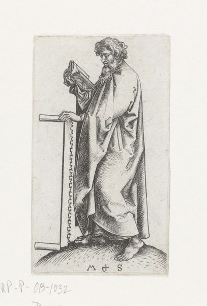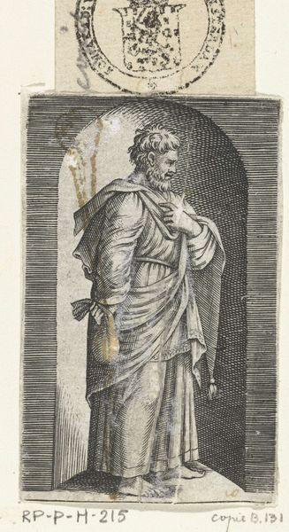 This is Marcantonio Raimondi’s engraving, "Apostle Philip with Cross," at the Rijksmuseum. The composition centres on the figure of Saint Philip, depicted with a cross, his emblematic attribute. Note how Raimondi uses line work to define form and texture. The background consists of fine, parallel lines that create a subtle contrast with the more textured rendering of the saint's robes and features. This technique directs the viewer's eye to the figure, set against a muted backdrop, giving it prominence. The cross and the book, held in the saint's hands, are not merely symbolic elements; they function as formal devices that structure the composition. Raimondi's engraving, through its formal qualities, not only represents Saint Philip but also reflects broader artistic and philosophical concerns of the time. It invites us to interpret how the art of engraving, with its emphasis on line and form, challenges and enriches the viewers understanding.