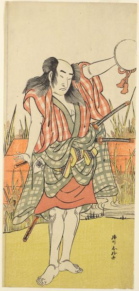 Curator: This is a woodblock print by Katsukawa Shunko. It depicts the actor Iwai Hanshiro IV in the role of Onaka. Editor: The flowing lines and soft palette give it a melancholic air, almost as if caught mid-performance. I'm immediately drawn to the checkered pattern of the kimono; it's quite striking. Curator: Absolutely. This hosoban print, roughly 31 by 14 centimeters, showcases the actor's role and personal brand within the Edo Kabuki tradition, where actors became celebrities. Editor: And the way the artist balances the static figure with the dynamic lines of the hair and sword creates a compelling tension. The use of negative space also adds to the overall sense of stillness. Curator: The print reflects the cultural significance of Kabuki theatre, where actors embodied and performed idealized roles that resonated deeply within society. Editor: It's interesting how Shunko uses the limited color palette to guide the viewer's eye, drawing us from the face down to the sword and the intricate patterns of the garment. Curator: Studying it through the lens of popular culture offers us a glimpse into the ways entertainment and celebrity were consumed and circulated in 18th-century Japan. Editor: Yes, it’s a brilliant example of how visual elements can convey narrative and emotion so economically.