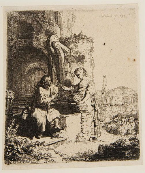 Curator: Here we have Rembrandt van Rijn's etching, "The Good Samaritan." Notice the intricate detailing, particularly the play of light and shadow achieved through varied line weights and cross-hatching. Editor: It feels almost like a stage set, doesn't it? That crumbling architecture in the background throws the foreground figures into such stark relief. Curator: Indeed, the composition guides the eye. Consider the central archway—a framing device emphasizing the narrative core. The lines direct us to the figures aiding the injured man. Editor: The light almost seems to emanate from the Samaritan himself, highlighting the kindness and compassion at the heart of the biblical tale. It is interesting to note the seated dog, a wonderful addition to the scene. Curator: His humanism, expressed through form and light, renders the parable timeless and relevant. Editor: Yes, it makes you ponder the meaning of compassion in our own world.