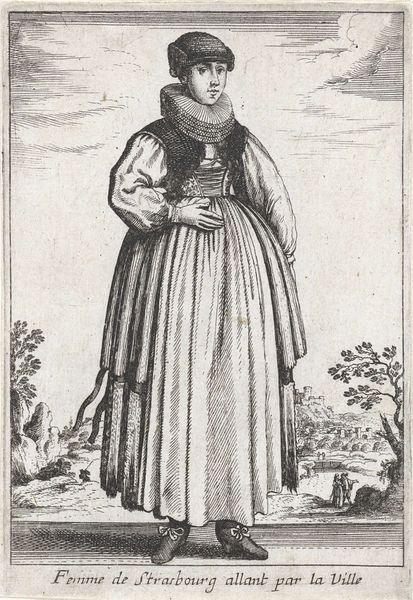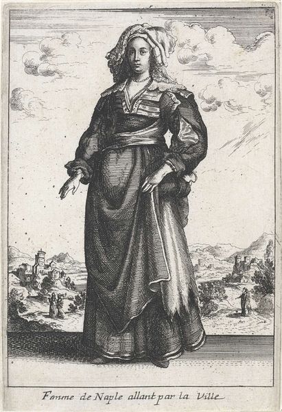 Editor: This is "Femme Angloise allant par la Ville," from 1662. It’s an engraving of an English woman walking in a city, currently held in the Rijksmuseum. It's fascinating how the artist used lines to create such detail, and I am curious about the woman's almost haughty posture. How do you interpret this work through its formal qualities? Curator: It's through those very lines that we find entry. Consider how they define the volumes of her dress, creating a rich interplay of light and shadow. Note, too, the contrast between the tight, almost obsessive hatching used for her draped garment versus the relatively sparse treatment of the sky and distant buildings. Editor: I hadn’t thought about the density of the lines creating volume like that. What effect does this contrast achieve? Curator: It emphasizes a hierarchy of form, with the woman placed as the subject against a softer background. Further observe the strategic use of the single viewpoint. She occupies almost the entire frame. Editor: It really directs the eye. Are there other details that speak to the emphasis of the female figure? Curator: Indeed. The subtle details – the wisps of hair, the delicate fan she holds, even the texture implied in the folds of her skirt – contribute to a formal reading of status. Now, what might the positioning of the woman relative to the landscape convey? Editor: Hmm, the rigid line of her figure contrasts with the organic forms of the landscape. Perhaps a subtle commentary on civilization versus nature? Curator: Precisely. These opposing forces create a dynamism. I trust we now recognize how critical examination reveals complexity through considered interplay of formal elements. Editor: Absolutely, I hadn't fully considered the power of line and texture in conveying meaning here. Thanks for that enlightening analysis.