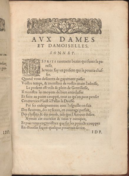 This is page three of "Les Singuliers et Nouveaux Portraicts," a book of portraits made in France around 1590 by Federico de Vinciolo. This page is not a portrait, but a dedication to the ladies and damsels who might use the book. In the late 16th century, printed books were becoming more common, but were still precious objects, and this one speaks volumes about the role of women in society. It suggests that women should be virtuous but also that they needed to be entertained and to occupy their minds, it also implies that women had enough wealth to purchase items like this one. Books like this one open a window onto the social lives of women in the late 16th century. To understand it fully, we would need to research the history of women's education, the publishing industry, and the material culture of the French upper classes. Only then can we properly understand the place of this book in its historical moment.