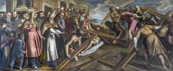 Palma il Giovane created this oil painting of the "Martyrdom of Saint John the Baptist" in Venice, Italy, likely in the late 16th or early 17th century. The painting is structured with a dramatic intensity achieved through its composition and use of light and shadow. The scene is arranged to draw the eye immediately to the stark contrast between the executioner and the pallid head of Saint John the Baptist. Palma uses the figures to create a sense of dynamism, capturing a pivotal moment in a frozen tableau. The figures are tightly packed, which creates a claustrophobic atmosphere and emphasizes the violence of the act. The composition employs a theatrical Baroque style, engaging with the viewer through its emotional intensity and dynamic arrangement. The painting is not just a depiction of religious martyrdom but also an exploration of the formal possibilities of color, light, and spatial organization to evoke visceral emotions. This piece functions as an aesthetic object and a complex construction of cultural and philosophical ideas that continue to resonate through interpretation.