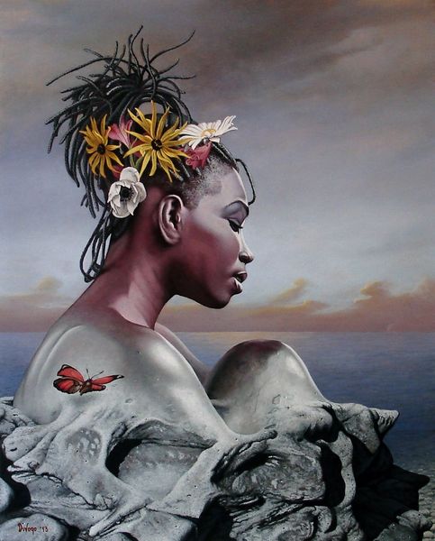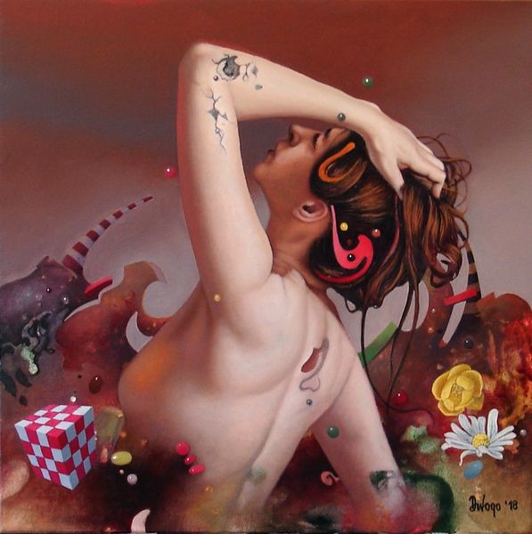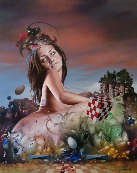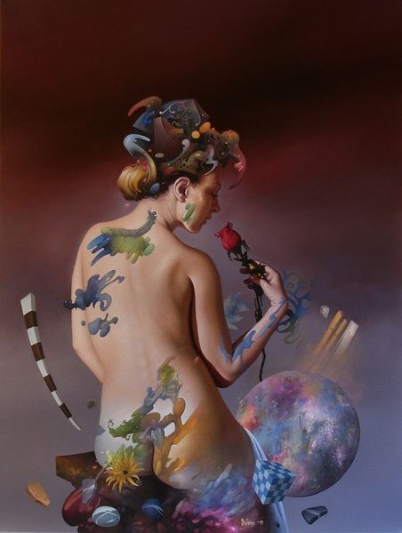 Editor: Here we have “Magnet,” an acrylic on canvas painted in 2012 by Dragan Ilić Di Vogo. It’s definitely striking—this nude figure perched on what looks like a dreamscape rock formation. It’s giving me a slightly melancholic vibe, but also a feeling of…potential? What pulls you into this piece? Curator: Melancholy, yes, I feel that too. But “Magnet,” for me, is about that magnetic pull of creativity itself. Look at her; she's perched, exposed, vulnerable, but utterly confident in her own space. The surreal objects scattered around aren't just decoration, are they? Editor: No, they seem to suggest something, but I can’t put my finger on it. Like that flower and the dice cube...and is that an egg? Curator: Exactly! They’re talismans, symbols—think the bloom of an idea, the calculated risk, the potential for birth, and new beginnings. I like to think the landscape itself is the interior of the creative mind. The way it kind of weeps colour—is she drawing this up herself? Or from us, the observer? Editor: Ooh, I like that perspective! It makes the title feel more…active, less passive. Like, she isn’t just *being* magnetic; she’s generating that force. Curator: And aren't we all magnets in our own right? Drawing, repelling. It is fascinating how he sets up a space where reality meets the symbolic so seamlessly, like waking up to a surreal, unexpected thought. It just *is*, suddenly. Editor: I never really thought of it that way, but now, seeing the landscape as a mindscape…it completely shifts how I read the whole painting. Curator: It’s funny how art does that, isn't it? Lets us magnetize our own meanings!