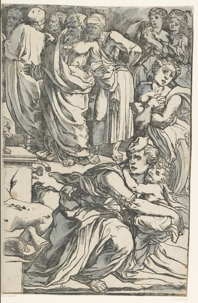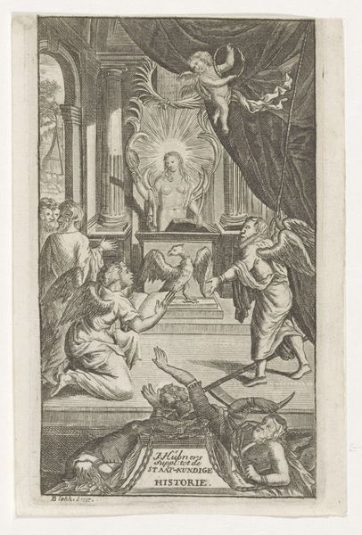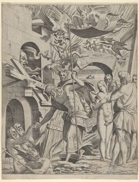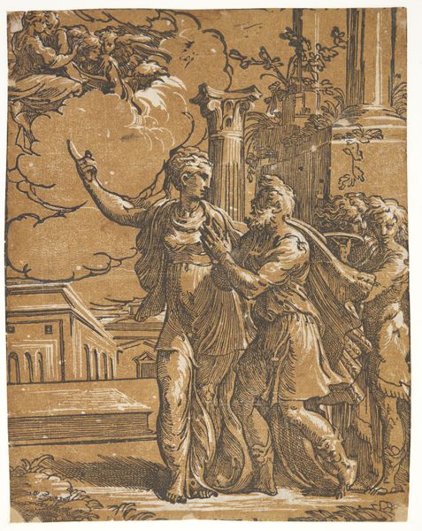 Hans Burgkmair created this engraving titled "Lovers Surprised by Death," now in the Städel Museum. The composition, dominated by sharp contrasts of light and shadow, evokes a palpable sense of dread. The architectural backdrop, meticulously detailed, provides a rigid framework against which the drama unfolds. Burgkmair masterfully uses line and form to convey complex ideas. The female figure, wings spread in horror, is rendered with dynamic lines that emphasize her emotional turmoil. Her gesture of desperation contrasts sharply with the static, skeletal figure of death, who is drawn with an unsettling calmness. The contrast here is critical. The lovers, caught in the act, are symbols of earthly pleasures abruptly interrupted. The allegorical narrative, rendered through precise lines and carefully modulated tones, invites a contemplation on mortality and the transience of human pursuits. Notice the skull, a memento mori, subtly placed in the architecture. This element serves not only as a reminder of death's inevitability but also as a structural component that reinforces the engraving's thematic concerns.