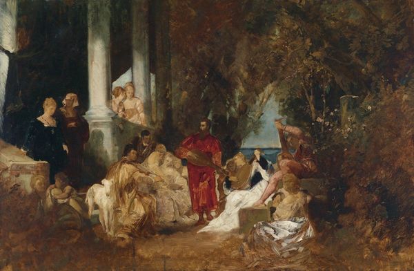 Konstantin Makovsky created this oil on canvas, titled Happy Arcadia, which presents a classical scene infused with a vibrant, almost dreamlike quality. The composition, organized into distinct foreground and background elements, draws you into a world of mythical delight. The arrangement and soft color palette evoke a sense of idealized naturalism. In the foreground, observe the lively scene with dancing nymphs, playing cupids, and a reclining satyr. Note the artist's use of light and shadow to define form. The figures seem to float and dance in a carefree abandon. The semiotic potential here is the contrast between the earthly and ethereal planes. The background, with its blurred, hazy landscape, provides a stage for the unfolding drama. The artist emphasizes the painting's formal qualities to convey a sense of timelessness and aesthetic harmony. This artwork invites viewers to contemplate the enduring relevance of classical themes in art and culture.