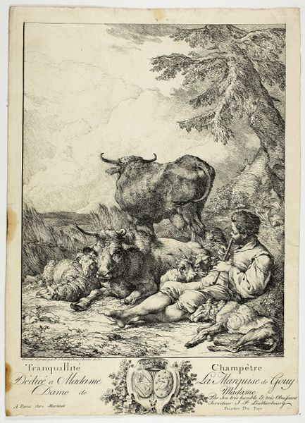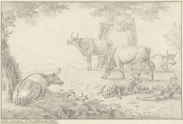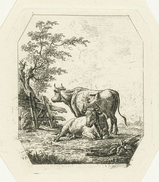 Curator: This is Antonie Franciscus Dona’s "Boerenerf met twee koeien, een bokje en een pratend stel" – "Farmyard with two cows, a goat and a talking couple" – etched in 1853. It captures a simple pastoral scene. What strikes you about it? Editor: It feels so still, almost melancholic. The light is soft, diffused. There's a real sense of quiet labor and the peace of rural existence… though the couple breaks the silence, I suppose! Curator: I'm interested in that couple, actually. Note how Dona includes figures—their postures almost blend into the trees and barn—that represent both industry and domesticity. In the genre scenes typical of Dutch painting, domestic scenes are rarely about labor itself but also a place where people form their morality, character, and their sense of citizenship. Editor: And there's a definite contrast to that, right? These farm animals appear to dominate the center, drawing attention away from any human concerns. Perhaps it comments on human relationship to nature as something subservient in reality versus cultural imagination. Curator: A plausible reading. Cows in art often represent fertility, abundance, and even patience. They ground the scene—quite literally! Also the use of etching here provides incredibly delicate texture, mirroring details of rural landscape Editor: I also wonder about this composition. The animals create almost a barrier between the couple in the background, barely registering a hint of what's been said in hushed voices... Is the idyllic vision somehow deliberately isolated, or obscured? How should this affect contemporary viewings? Curator: That might be a romantic over-interpretation! In general, such images reinforced societal ideals and norms; etching itself made the visual culture accessible across society, embedding symbolism deeper. But such accessibility to genre images could very well contribute, in part, to the societal values which later triggered different reform movements, in terms of industrial and post-industrial ecologies. Editor: An excellent point – to read this etching beyond surface is imperative! What initially appears as a passive vista subtly underscores both idealized themes of agricultural and familial life. Curator: Indeed. There is always so much happening in apparently quiet images! Editor: Precisely why we keep looking.