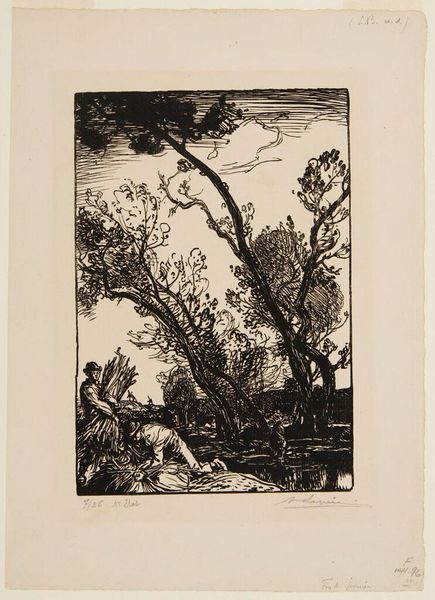 Curator: Ernst Ludwig Kirchner's "Fruit Trees at Gollsberode," now residing at the Harvard Art Museums, presents a fascinating landscape. What's your immediate take? Editor: Stark. The crude, heavy application of ink gives it a rather unsettling feeling, despite the pastoral subject. You can almost smell the earth. Curator: Interesting. I see this as a reflection of the changing German landscape. The art world shifted dramatically in the early 20th century, moving to more public displays of artwork. Editor: And what of the material realities? Lithography allowed for wider distribution. This wasn't meant for a wealthy patron's private collection, but for a broader audience. It democratized art. Curator: Precisely! Kirchner, along with Die Brücke, sought to challenge academic traditions, both institutionally and aesthetically. Editor: It's a powerful piece, charged with an almost rebellious energy evident in its very making. The raw materials, the printing process, all speak to that. Curator: Agreed. It embodies a pivotal moment in art history. Editor: Absolutely. It’s an important example of art’s transformative power.