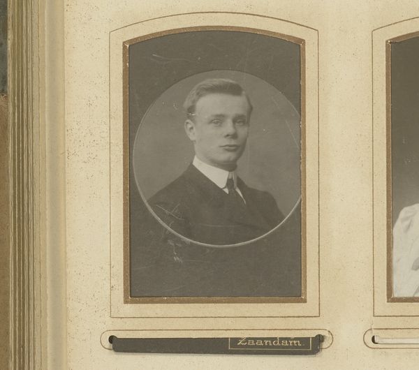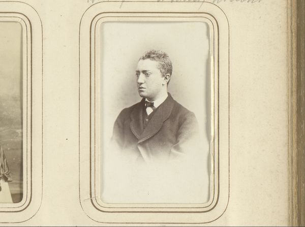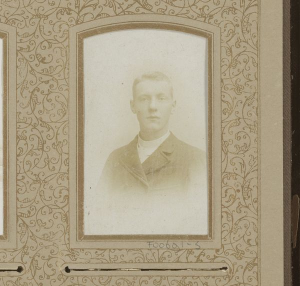 Curator: Here we see "Portret van een jonge man", a photographic work made sometime between 1882 and 1885 by Nicolaas Johannes Rinner. Editor: My first impression is of faded formality, the somber tones contributing to a subdued but dignified mood. Curator: I am drawn to the albumen print. This would have been a highly skilled artisanal craft, from the preparing of the glass plate to the mix of egg whites and chemicals needed to bring this young man to life, offering us a fascinating glimpse into the technologies and practices that defined photographic portraiture of that period. Editor: Note his formal attire; it projects an aura of nascent respectability. The slightly unfocused gaze gives me a feeling of contemplation, or perhaps slight uncertainty. Does it hint at dreams, maybe unrealized aspirations? Curator: Perhaps the formal trappings mask something else: the constraints placed on photographic production at this time. A formal studio portrait, I’m afraid. Editor: I see what you mean. Still, those soft, sepia tones whisper of a past world and personal stories, preserved in silver and light. A world struggling to be modern and finding it difficult. Curator: Exactly. Consider the material reality here: silver compounds, meticulously processed on paper, resulting in a commodified likeness, displayed on the mantelpiece to show their aspirations in life. How would he afford it? Was this part of a collection displayed at his future wife’s place? So many possible interpretations when we look through the lens of social practice. Editor: A captivating tension between surface representation and underlying realities then! We must always bear in mind the powerful iconography and the social framework to which this image speaks. Thank you, an elegant examination! Curator: The pleasure was all mine. Understanding the techniques, materiality, and societal conditions in which this photographic image came to life makes you wonder who the audience was for the photo and for what reason. I appreciate that point so much!