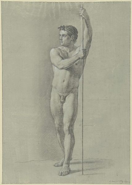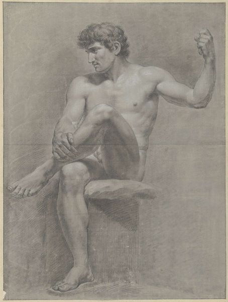 Editor: This drawing, "Studie naar het standbeeld van een bokser," possibly from 1779 by Jean Grandjean, is rendered in pencil and charcoal. The figure, a classical boxer, seems poised between defense and potential aggression. What strikes you most about the image? Curator: The enduring power of the human form to convey a narrative is striking here. This boxer is a conduit, channeling the cultural memory of athletic ideals and perhaps even, more subtly, the brutality inherent in those contests. Look at the intensity of the shading around the figure's torso - where does the symbolism of light and shadow take us? Editor: It seems to heighten the musculature and therefore the power but also suggests internal turmoil or perhaps the fleeting nature of strength? Curator: Exactly. Light has always signified knowledge or divine grace, whilst shadow obscures. Perhaps the interplay of light and shadow touches upon themes of glory and pain, echoing the rise and fall that so many cultures assign to champions. Notice too how the raised arm both asserts dominance and appears almost as a shield. How might such gestures resonate psychologically? Editor: Maybe the raised arm also implies protection or warning? It is about to deliver a blow. The drawing style is quite academic and realistic; were similar studies prevalent at this time? Curator: Precisely, during the late 18th century, academic studies were important to understand and refine classical ideals of the human body, almost a revival. I wonder, what feelings does this particular image stir in you, given what we now understand about athletic performance and sacrifice? Editor: I now better understand how the artist's rendering uses symbolic language of light and form to layer a complex psychological narrative within a seemingly simple figural study. Curator: Indeed. And with each gaze, and perhaps each generation, new interpretations and symbolic significance emerge, carried within these enduring forms.