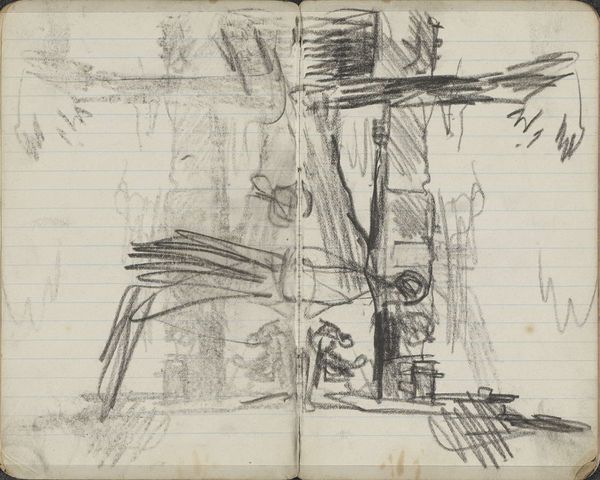 George Hendrik Breitner created this drawing, "Schepen in Amsterdam," with pencil on paper. The sketch offers a fleeting glimpse of ships, dominated by dense, almost frenetic lines which convey a sense of restless movement. The composition is split, with a lighter, ghostly echo on the left contrasting the bolder, more defined forms on the right. Breitner's choice of line is critical. It's raw and immediate, capturing the energy of Amsterdam's harbor. This sketch embodies a shift away from traditional, polished depictions towards a more modern, subjective experience. The varying pressure of the pencil creates depth and suggests the play of light and shadow on the water. This work invites us to consider how Breitner uses the simplest of means to evoke a complex, dynamic environment. It’s not just a picture of ships; it's a study of form and energy, capturing a moment in time with remarkable immediacy.