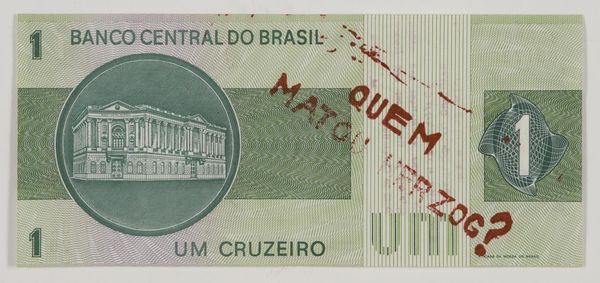 Curator: Let's discuss Cildo Meireles' "Insertions into Ideological Circuits 2: Banknote Project." It's a politically charged piece where Meireles stamped banknotes with questions and statements. Editor: It feels like a whispered scream. Seeing that question, “Quem matou Herzog?” [Who killed Herzog?] on a banal object like a banknote... it's chilling. Curator: The artwork directly confronts state violence and censorship during the Brazilian military dictatorship. Herzog, a journalist, was murdered by the regime, and this work circulates that forbidden question. Editor: Exactly! Money talks, right? But here, it shouts. It’s a clever subversion, turning currency into a tool of resistance, spreading truth where it’s least expected. Curator: It highlights the power of art to disrupt established narratives and engage with crucial socio-political issues. Editor: It’s a haunting reminder that even small acts of defiance can carry immense weight.