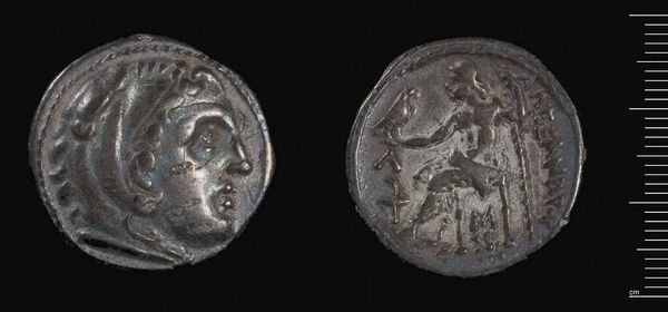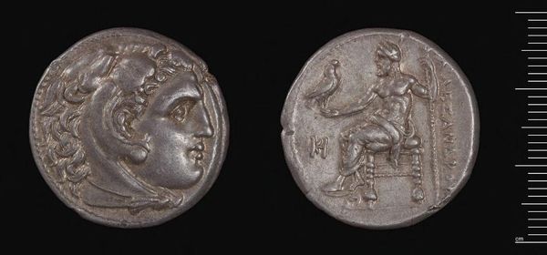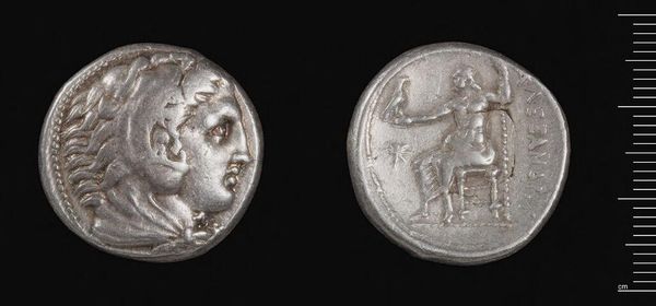 Editor: Here we have a Tetradrachm of Alexander III, the Great, likely crafted in Babylon. It’s made of metal and weighs just over 16 grams. I'm struck by how such a small object could carry so much symbolic weight. What can you tell me about its historical significance? Curator: This coin wasn’t just currency; it was propaganda. Minted after Alexander’s death, it presents a carefully constructed image of power and divinity. Notice how it circulated widely, standardizing imagery and projecting Hellenistic rule throughout the conquered territories. How do you think this standardization impacted local cultures? Editor: It probably overshadowed them, visually reinforcing Alexander’s dominance. I hadn’t considered the political power of a coin before. Curator: Exactly. Consider this: How did controlling coinage influence economic and cultural exchange? Editor: I guess it gave them a lot of control over trade and the spread of ideas. Thanks, I have a lot to think about.