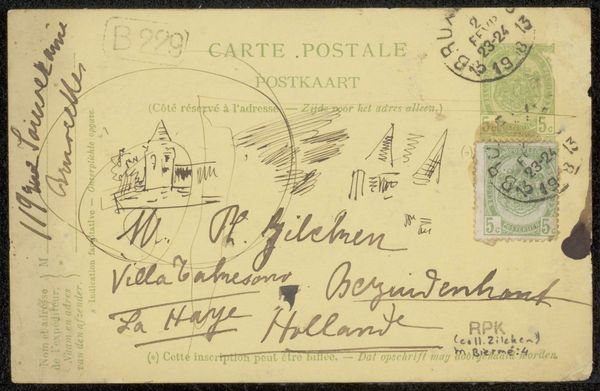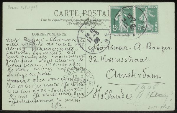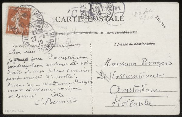 Curator: Editor: This is "Prentbriefkaart aan Andries Bonger en Anne Marie Louise van der Linden," a postcard made before 1917 by Émile Bernard. It's ink on paper, and the handwritten text is really striking. What stands out to you in this piece? Curator: For me, it's about the physical exchange – the social transaction – embedded in this small object. Consider the materiality: paper, ink, the very act of writing with a pen. These are not ethereal artistic pursuits, but tangible forms of labor and communication. The postcard becomes a carrier, not just of the artist's words, but of the whole social and economic structure that enables its production and distribution. Editor: That makes sense. So you're less interested in the style—it's Post-Impressionist—and more in, like, the means of sending a message? Curator: Exactly! The calligraphy isn't just aesthetic; it represents the artist’s hand, their physical involvement. The postal stamps, the address meticulously written – these elements ground the art within a network of exchange and consumption. What about the implied reader? How do you imagine them interacting with the object? Editor: I guess the recipients, the Bongers, would've handled this and then likely kept it. They became part of this distribution, preserving a functional piece. Does that blur the line between craft and art? Curator: Precisely. By examining the materials, the labor, and the social context, we can challenge these traditional boundaries. The postcard isn’t simply a canvas for artistic expression but rather a site of production and consumption in itself. Editor: It’s interesting to think about art that way - considering not just what it depicts but its role in a much bigger system. Curator: I agree. It changes how we value the everyday "artwork," and how it facilitates societal bonds.
