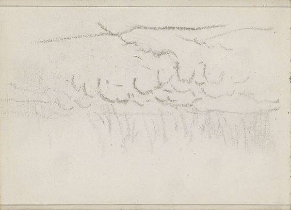 Curator: Allow me to introduce you to "Landschap met molens en grazende koeien in Hillergerberg", a drawing by Johannes Tavenraat from 1868 to 1869. It's rendered in pencil. It resides here at the Rijksmuseum. Editor: It's just… the barest whisper of a place. A dream you're desperately trying to remember as you wake up. Sort of melancholy, no? Curator: Perhaps the melancholy arises from what's *not* there. This is, indeed, a landscape, but also an idea of a landscape, a study in potential. We can sense the Dutch Golden Age tradition of pastoral scenes, idealized visions of harmony. Editor: But stripped way back! No luscious color, no overflowing detail. It's all… suggestion. The mills are barely there, just scribbles really. And the cows – tiny, vague smudges. Is that a bench at the top right? What’s its symbolic presence? Curator: I believe it serves a rather straightforward purpose. Think of a symbolic object: It represents leisure and observation, implying human contemplation of the natural world. The sketch emphasizes not the object itself, but the human experience within this environment. A space of reflection. Editor: Which is kind of funny, because the overall impression is so fleeting! You know, the impermanence of it all, despite those traditionally enduring symbols. It's like memory itself: fragmented, ethereal. Curator: Precisely! Tavenraat isn’t merely depicting a landscape. He's also capturing a specific moment in time, a transient interaction between light, atmosphere, and perception. Consider those blotches at the bottom. The effect of pencil wash that mimics cloud cover over water? It makes you wonder. What's to read from all these combined? Editor: What strikes me now is its honesty. It's unpretentious, immediate. Not a grand statement, just… a quiet observation. No idealized harmony to speak of. It's humble. I respect that. A world in graphite. Curator: A poignant reminder, wouldn't you say, that even in simplicity, a rich tapestry of meaning and emotion can unfold? A brief pause with great impact! Editor: Yes, just goes to show, you don't need much to stir the soul. Sometimes the sketchiest glimpses hit the hardest, that's certain.