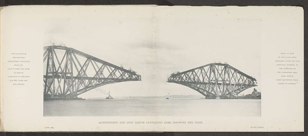 Curator: Looking at this image, I am immediately struck by a sense of melancholy, a feeling of faded grandeur, or perhaps a memento mori of industrial achievement. Editor: Today we’re exploring “Cantilevers Complete,” a captivating etching possibly from 1889, documenting a magnificent feat of engineering. What intrigues you most about its materiality? Curator: The contrast of textures—the smoothness of the aged paper against the intricacy of the etched lines. It reminds me of a page from an antiquated personal journal. The bridge's geometric framework dominates, certainly. I sense how light interacts, dividing forms—emphasizing perspective and scale. Editor: Exactly. The etching process itself—the labor, the careful application of acid to the plate, and then the physical pressing onto the page. It’s a fascinating collision of human skill and mechanical reproduction. Consider the immense physical labor involved in constructing the bridge depicted, a story deeply intertwined with this photographic etching printed onto this paper medium. Curator: I perceive a complex network of triangles, repeated, unified to compose a monumental shape that dwarfs its surrounding landscape. Does it provoke for you, ideas about modernity and industrial progress? Editor: Indeed, a visual assertion of Victorian ambition but produced, printed, and shared as both document and collectible—these landscapes underscore a shifting definition of "picturesque" itself with technological advancement and mass material production at its core. We shouldn't underestimate this image's journey. From creation on site and then distribution among engineers to the growing rise in industrial photography being collected as part of a larger visual culture— Curator: I agree. This contrast of form creates tension: an interplay between organic shapes with industrial geometric structures; further accented by this light-coloured aged paper that surrounds this captivating photograph that may seem ghostly now because of time. The image compels through its spatial tension that offers both depth but also invites a flatter, more planar consideration. Editor: And beyond geometric visual analysis, the materials themselves carry cultural weight. The paper signals a relationship with craft, the print alluding toward dissemination among working people. This etching bridges the gap between artisanal practice and industrial consumption, offering a glimpse into the values placed both on artistic skill and efficient design to represent the labor required in its industrial process. Curator: What began as an initial study through form evolves to engage socio-historical insight. Fascinating how modes of looking create layered dialogues. Editor: Absolutely, analyzing its material origins and dissemination offers insights into how "Cantilevers Complete" spoke – and continues to speak – about technological progress.