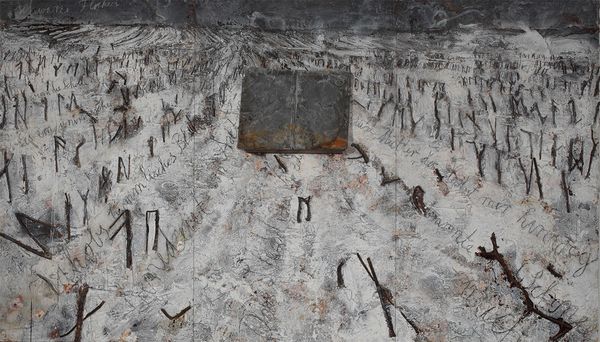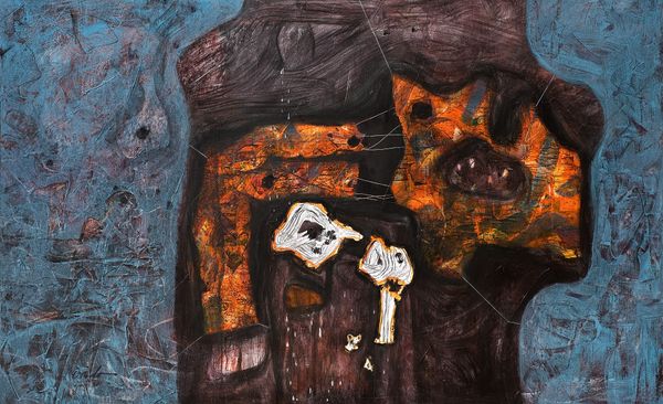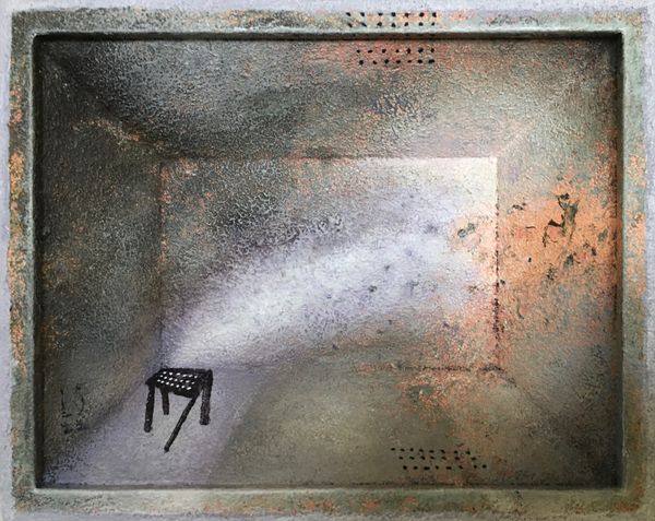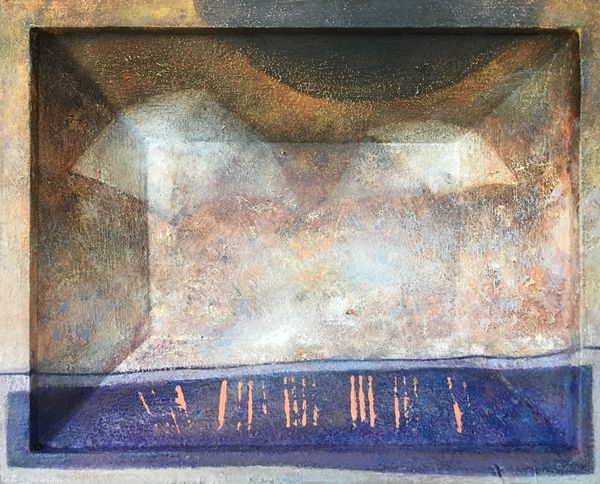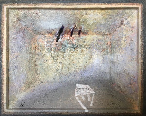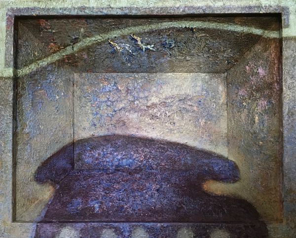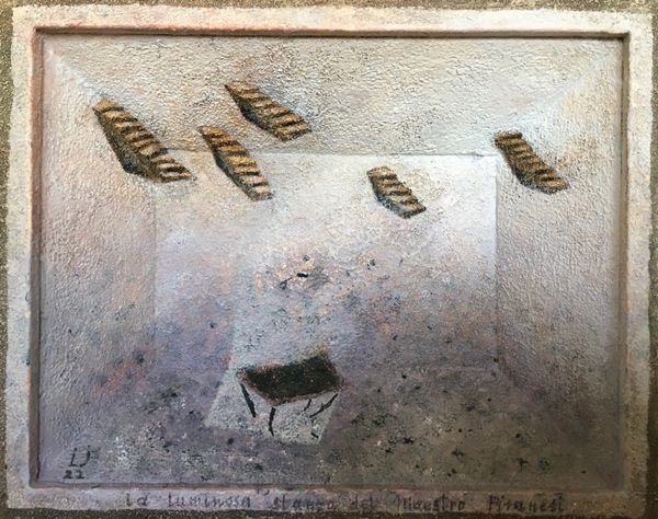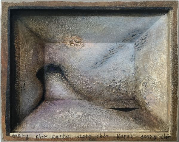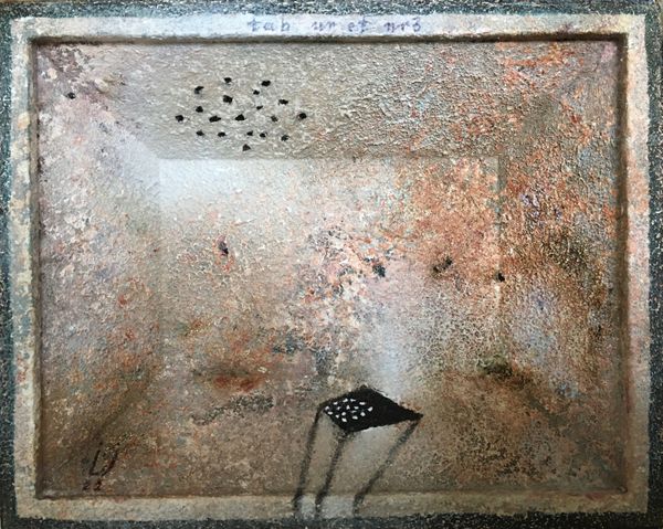 Editor: So this is "tab ur et", made by Lech Jankowski in 2021 using mixed media, including what looks like acrylic paint and watercolors. It's giving me this slightly unsettling vibe, like a childhood memory seen through a cracked lens. What are your initial impressions? Curator: Unsettling is spot on, and beautifully put. For me, it evokes a feeling of being trapped within a memory, a claustrophobic dreamscape, maybe even a visual representation of writer’s block, or being stuck in a liminal space. The textures suggest a decay, a fading, don't you think? Almost like looking at an archaeological dig... if the artifact was a state of mind. What do you make of the recurring little shoe shapes trailing above the table? Editor: Hmm, that's an interesting comparison. The textures almost look aged. As for the shoes, maybe they signify journeys, or ideas taking flight? It feels almost like the table, the "tab ur et", is this launching pad for something more. What about the title itself - "tab ur et" - why not just "tabouret" or "stool?" Curator: The deliberate misspelling does add another layer, doesn’t it? Perhaps Jankowski wants us to question the stability of language itself, to highlight the gap between word and object. He might be playing with the idea of misremembered names. Is that an entry, an exit, or perhaps the prison bars? Editor: Prison bars – yes, it’s ambiguous for sure. The mixed media adds a depth, literally and figuratively. Seeing the layers makes it feel more personal, like a build-up of thoughts or experiences. Curator: It certainly encourages you to look deeper, doesn’t it? Like rummaging around in your old memories... I guess that's the real power of abstraction; the artwork only works if the viewer feels an immediate connection or recalls something, otherwise it falls short of any profound experience. It definitely has impact. Editor: Absolutely. I came in seeing a slightly spooky image, but now I am sensing layers of buried thoughts that rise to the surface. The artist wants to make an impression with a unique idea. Thank you, Lech! Curator: Likewise! It’s always rewarding when art pushes us beyond our initial perceptions, isn’t it?