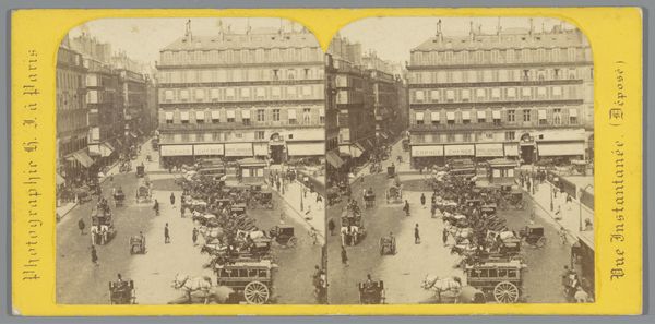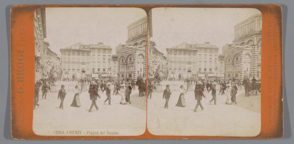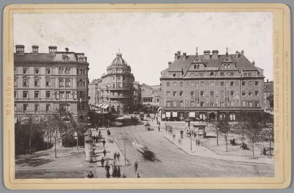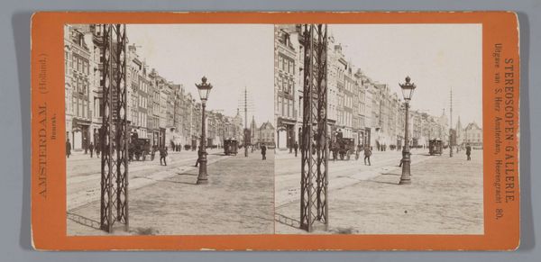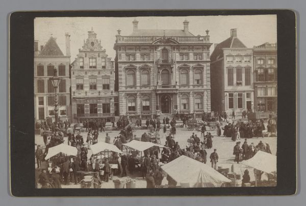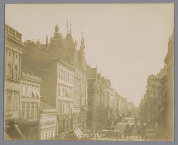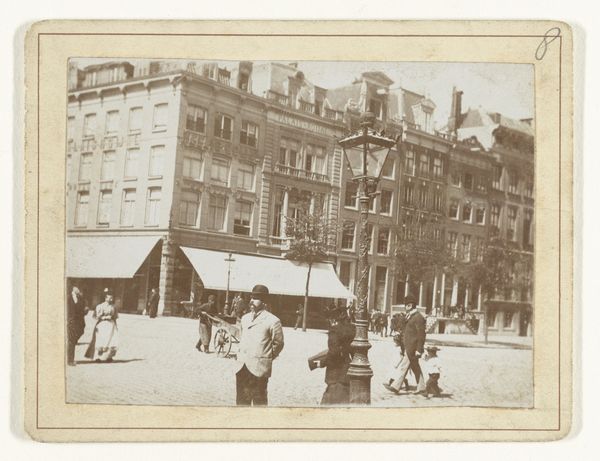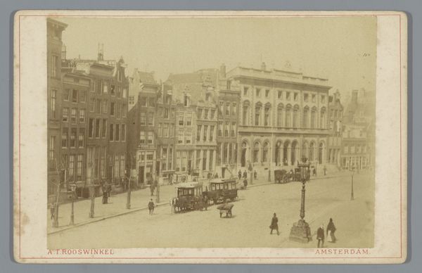 Curator: Look at this wonderful gelatin silver print; it’s “Gezicht op de Dam met paardentrams in Amsterdam,” or "View of Dam Square with Horse-Drawn Trams in Amsterdam" if you prefer! The photo, by Gerrit van der Mey, dates to before 1895. What's your first reaction? Editor: The hazy light immediately gives me a feeling of nostalgia, a real window into the past. The trams and figures look almost ghostly, yet the architecture stands strong, timeless. Curator: That haziness, that dreamy quality, aligns this photograph with the pictorialist movement, a trend toward artistic photography, and of course, this photograph shares many traits with genre painting, focusing as it does on everyday life. You can almost hear the clip-clop of the horses! The materiality itself, the silver gelatin, lends this image an almost magical depth. Editor: Absolutely. It's interesting how the architecture serves as these imposing symbols of authority and permanence, whereas the people and trams signify something ephemeral, a transient existence in contrast to history bearing down upon them. Curator: Indeed, there’s a lot of cultural memory layered into a single frame. I’m struck by how the perspective flattens the scene slightly, almost as if the photographer sought to create a stage for daily life unfolding. And the clothing! Top hats, bonnets—it’s like a tableau vivant. Editor: Those details are powerful emblems, too, aren't they? Consider the horse-drawn tram itself, now an artifact, but then a symbol of modernity, of progress. Its cultural resonance carries the weight of aspiration and social evolution. Curator: Van der Mey definitely captures a precise moment in time, where the past and the future seem to meet right there in Dam Square. A very poignant crossroads. What a wonderful moment to reflect on. Editor: Absolutely. The way we continue to interpret these symbols, from trams to top hats, offers continuous access to how our understanding of the world transforms across time. Powerful stuff!