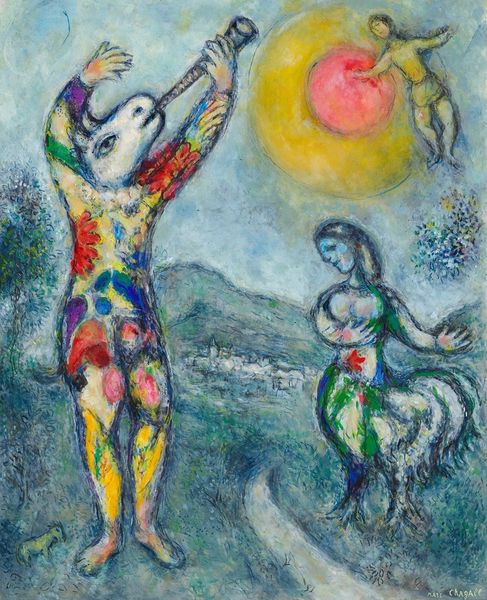 Curator: Alright, let’s dive into Chagall's "La mariée au cirque," painted around 1980. It's a piece that always feels like a half-remembered dream, doesn't it? Editor: It certainly does! I find myself drawn to the… theatricality of the figures? There's a performer, a bride, is that a horse in the center… All in this intense blue palette of oil paint. It is very moody, actually. What are some things that you notice first? Curator: That saturated blue, you nailed it! It’s the atmosphere Chagall creates. For me, it’s about how he juxtaposes seemingly disparate elements—a wedding, the circus—to explore themes of love, performance, memory, and perhaps even the beautiful absurdity of life itself. Does the way he combines these things remind you of anyone else's work, perhaps even poetry? Editor: Hmm, that contrast almost creates a kind of visual poem? I suppose, perhaps something of Apollinaire in that it bends the ordinary. Curator: Exactly! Now, about the bride herself – what feelings does her expression evoke in you? And how do you think the circus elements enrich, or perhaps even complicate, that feeling? Editor: It is definitely more serious than I expected! It does not feel too celebratory to me! Her eyes feel very mournful... is she happy? What could that tension between marriage and that circus scene tell us about Chagall? Curator: Beautiful! Perhaps that's precisely the point, isn't it? Chagall rarely gives us easy answers, and that's the magic of his paintings. He invites us to bring our own stories to these open-ended scenes, so that these scenes become our experiences of marriage! Well, what has stood out most for you? Editor: The tension – that this image blends what is absurd with that sadness in the figures to reveal how love itself blends those together as well. What about you? Curator: Ah, seeing you unlock the sadness inside this dream has been brilliant. Art reveals to us things we could not ever reveal for ourselves.