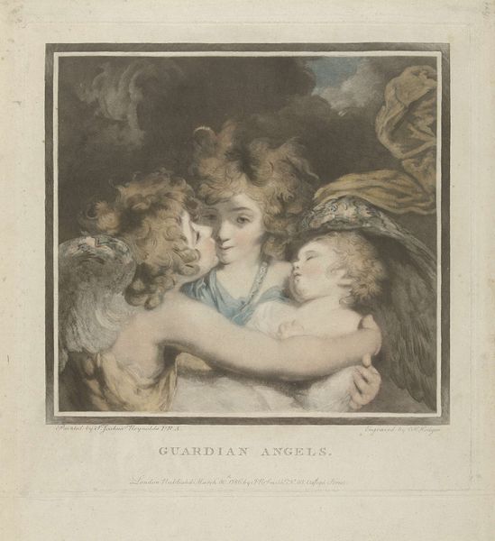 Curator: Here we have Charles Howard Hodges’ "Two Angels," created in 1799. The artwork, currently held in the Rijksmuseum, is an engraving presented within an ornate, circular frame. The image itself centers on two ethereal figures. Editor: My first thought is just how serene and innocent the figures appear. The soft pastel tones create an almost dreamlike atmosphere. There’s an inherent vulnerability. Curator: Precisely. It's a beautiful example of Romanticism. Note the subtle gradation of light and shadow that models their faces, directing our eyes upward, as if guided by faith. The line work itself has an interesting duality. There’s an economy of line overall, with just enough detail to articulate form, yet the textures—particularly within the wings—suggest great density. Editor: Looking through the lens of gender and representation, it's interesting how the angels are depicted. They possess an almost androgynous beauty, aligning with certain Romantic ideals but also possibly reflecting societal views on gender roles in relation to spirituality and purity at the time. I also see here a visual encoding of power relations; they both look up, submitting. Who are they beholden to? What gazes are being returned here? Curator: That’s a valid point. Hodges employed specific artistic strategies to convey a sense of piety and beauty within established 18th-century conventions, however, the interplay between idealised form and delicate rendering enhances its affective power. It certainly evokes sentimentality and wonder. Editor: I'm always fascinated by how artworks like this—meant to inspire reverence—can also reflect complex and often unquestioned power dynamics. It prompts consideration on how religious imagery perpetuates specific notions about virtue, gender, and submission. And I keep asking myself, in what social and political contexts was Hodges creating this art? Curator: I find it remarkable how a relatively simple composition, presented as an engraving, can spark such different interpretive pathways, revealing the multilayered aspects inherent within representational imagery. Editor: Indeed, engaging with these nuances gives us a more profound grasp of our art history.