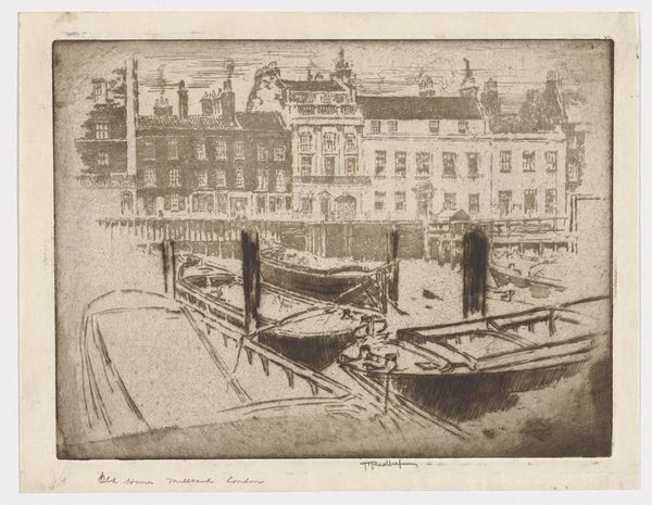 This is "Old Houses, Greenock" by David Young Cameron. In this etching, notice how the buildings are rendered with a rich tapestry of lines and shading, creating a sense of depth and texture. The detailed facade of each building reflects the artist's interest in architectural form, while the ripples in the water introduce a dynamic element that activates the scene. Cameron employs a sophisticated use of perspective, drawing the eye along the river to the buildings, which dominate the composition. The reflections in the water create a semiotic interplay between the real and the mirrored, inviting us to question the stability of what we see. The lines serve not just to depict but also to express a particular mood, where the precision of the architecture contrasts with the fluidity of the water. In viewing this work, consider how Cameron uses line and form to construct an environment that is both familiar and complex. The artist offers an engaging visual and intellectual encounter.