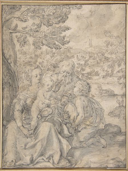 Editor: This is "The Holy Family with Two Angels," a drawing made with pencil and charcoal, sometime between 1598 and 1654 by Alessandro Algardi. There's a real tenderness in the faces of Mary and Joseph, and a curious watchfulness in the angels... what jumps out at you when you look at this? Curator: Tenderness indeed. You know, what grabs me is the *effort*. The sheer, palpable *work* that Algardi poured into capturing such ephemeral things as, say, love or divine serenity. See how the charcoal sort of vibrates around the edges of their forms? Editor: Yes, it's not crisp, it’s almost hazy… Curator: Exactly! It gives the whole scene this… otherworldly quality, doesn’t it? Almost as if he’s trying to trap a dream on paper. Tell me, do you get a sense of this being a study for something larger, or a finished piece in itself? Editor: I can see it as a study. It feels like he's working out the composition and light… preparing for something bigger, perhaps a sculpture. Curator: Precisely! Think of Algardi primarily as a sculptor and this makes sense. What I adore is how the constraints of a single medium, pencil on paper, became a springboard. It's more than just preliminary. This drawing contains something of the monumental even at this scale. You almost hear the clang of chisel against marble, don’t you? Editor: I think I do. This changed the way I look at drawings as preparations... now I’ll be thinking about them as complete thoughts! Curator: That's the beauty of diving into these works, isn't it? Discovering new ways to listen, new ways to feel.