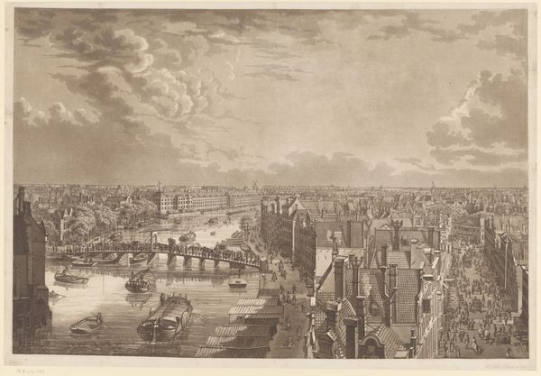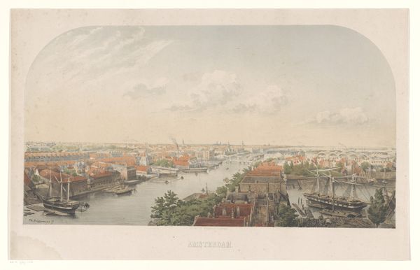 Curator: From our collection at the Rijksmuseum, we have “View of the Amstel in Amsterdam from the Mint Tower,” a watercolor created by Willem van Senus between 1828 and 1851. Editor: The pale washes give it a dreamlike quality, as if seen through a misty window. There is an abundance of roofs crammed together, their clay and slate tiles forming a dense pattern. It makes me think of the collective labor required to build such a bustling metropolis. Curator: Yes, consider how the Mint Tower functions not just as a geographical marker but as a symbolic anchor. Its prominence is indicative of the historical significance of Amsterdam, the role it plays in both Dutch commerce and in the broader cultural imagination. The viewer gazes over a landscape dotted with tiny figures—the common people moving to and fro—participating in the market. Editor: Indeed. It’s crucial to acknowledge the material processes at play here, not just within the city's economic heart but also in Senus’ artmaking process itself. Watercolor allows for layering and transparency. Look closely at how he balances control with a certain fluidity, echoing the delicate balance required for maintaining Amsterdam’s extensive canal system. Curator: Water is a vital component for both painting and civilization. In that Romanticist moment, artists aimed to convey deep feelings and spirituality. Consider the emotional depth that Senus imbues the image with through carefully considered details – even in something as functional as a cityscape, he points to an ideal vision of Dutch identity. Editor: The boats are heavily laden, promising transactions for someone, wages maybe. The very act of transporting materials by water reveals so much. I’m left considering the unseen hands that fueled this trade, the material foundation of a thriving port city visualized in the delicate strokes of watercolor. Curator: Exactly. Art can also be a historical record and social critique. This single image represents commerce, navigation, history, community, and national identity. It is no wonder it’s one of our most admired artworks. Editor: An artwork about how labor shaped not only the city's economy but also its social fabric, a powerful image of Amsterdam told through the details of the materials.