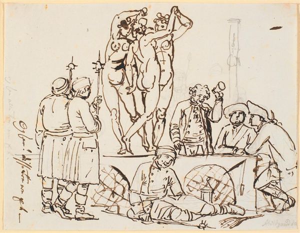 Ernst Willem Jan Bagelaar created this pen and ink drawing of eight figures around a table in the late 18th or early 19th century. It's a modest work, made with readily available materials: paper, and iron gall ink which was the standard writing medium in Europe for centuries. The artist has used simple, unmodulated lines to define the figures and setting, adding depth through hatching and cross-hatching. The ink, made from iron salts and tannic acids, has a brown hue that gives the drawing a sense of warmth and age. The rapid strokes suggest the artist made this drawing with speed, and perhaps a degree of spontaneity. In its original time, this drawing would have been considered a study, a means to an end. But its modesty is part of its charm; it gives us direct access to the artist’s process of visualizing a biblical scene. By considering these aspects of material and making, we can see how Bagelaar blurred the lines between preparation and finished work, between craft and fine art.