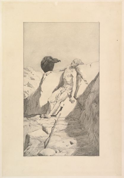 Curator: What a wonderfully intimate and subdued piece. Mariano Fortuny Marsal's etching, titled "Meditation", captures a quiet moment. What’s your initial impression? Editor: There is a sombre feel, wouldn’t you agree? The figure seems weighed down, almost merging with the stone wall. I think the limited tonal range adds to the overall melancholy mood, almost like faded memories. Curator: Agreed. Fortuny’s choice of the etching medium itself speaks volumes. It allowed for mass production, bringing images to a broader audience. Do you notice how the rapid and light mark-making creates varied textures in a subtle yet striking way? It hints at the industrial processes democratizing art at the time. Editor: Certainly, and looking at the etching technique, the precision and control he achieves with those delicate lines creates incredible detail in the figure's clothing and the surrounding foliage. What does that precision and attention to detail suggest to you? Curator: Well, perhaps an engagement with Romantic notions of leisure for the upper class, as seen by his relaxed pose; while also, quite clearly being framed, he appears idle and deep in thought. Editor: I see your point, particularly within the context of his garb. Ultimately, I come back to the texture he creates with such simplicity. The rough stone against the finery of the coat and trousers create a really arresting juxtaposition. Curator: A point very well-taken. The contrast underscores both the figure’s separation from nature as well as that inherent connection—revealing more subtle class-based divisions in artistic representations and perhaps social anxieties that come with their own kind of weight. Editor: Exactly. These fine differences are ultimately where the heart of Fortuny’s message lay, as he captures with his etching such quiet complexity in form and content. Curator: Yes, absolutely. "Meditation," indeed gives us so much to meditate upon. Editor: Well put; indeed it does.
