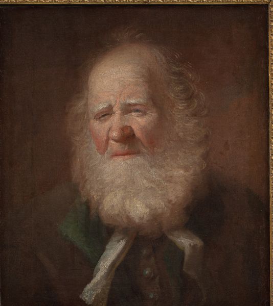 Editor: This is Rembrandt's "Self-portrait at the Age of 63," painted in 1669. The texture is so heavy, almost sculptural with those thick brushstrokes. There's such a melancholy feeling in those eyes, isn't there? What's your take on this Rembrandt self-portrait? Curator: Oh, Rembrandt! This particular piece, it feels like peering directly into a soul, doesn't it? Forget the velvet and gold of so many portraits from the Baroque, here we have raw, unfiltered honesty. You see how the light catches the wrinkles around his eyes? It's not cruel; it's just… truth. You get the impression of the weight of living etched into his face, the sort of things you carry with you over decades, what do you feel it speaks to? Editor: I definitely see the "weight of living" idea, almost as if he's documenting his own mortality. The darkness surrounding him amplifies that, like he’s fading into it. Is that intentional, you think? Curator: Absolutely intentional, it is as if he embraces it, instead of avoiding it. He’s staring it down. Look at the layers upon layers of paint. You almost feel like you're seeing the many versions of himself he has been. This work isn’t just about appearance; it is, in essence, a meditation on time, art, legacy, love, the whole caboodle of existence distilled onto canvas! Editor: So powerful. I’ll never look at a Baroque portrait the same way. It's like Rembrandt dared to be completely vulnerable. Curator: Precisely, I wonder whether we should all strive to be so courageously exposed, so ready to look and be seen, for who we are? It truly takes your breath away!
