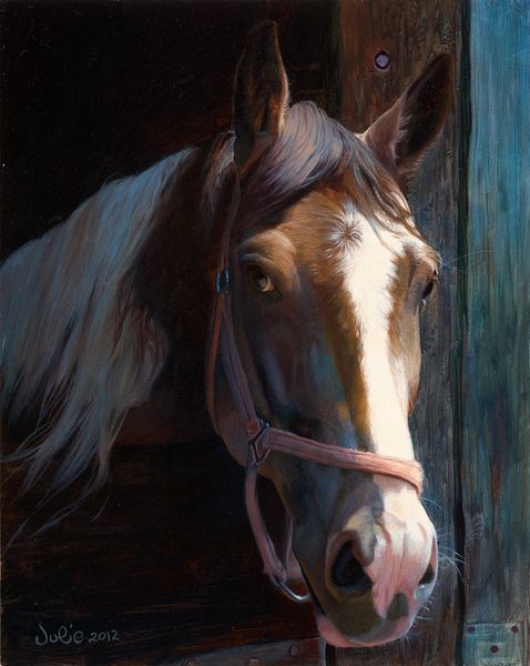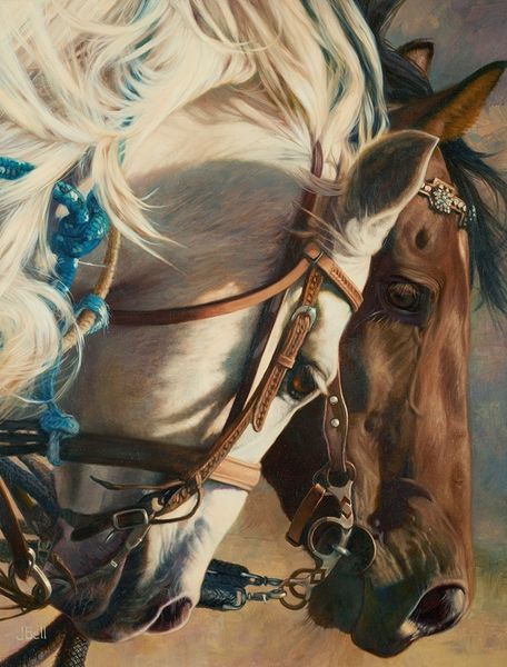 Julie Bell, born in 1958, created "Secrets," an undated artwork. It is immediately striking how the intertwined forms of the two horses dominate the composition. Their close proximity and shared color palette, primarily warm browns and golden yellows, create a sense of intimacy and unity. Bell’s approach, while representational, flirts with abstraction through her focus on texture and light. Observe how the flowing manes are rendered with a dynamism that almost obscures the underlying forms, reducing the horses to studies in movement and light. The artist uses a limited color range to create a harmonious effect, yet the variations in tone and saturation bring out the subtleties of muscle and bone beneath the skin, resulting in a push and pull between detail and suggestion. The almost photorealistic rendering of textures against the abstract dynamism is a crucial aspect of the work's semiotic structure. This contrast destabilizes our expectations of form, prompting questions about representation and perception. Ultimately, "Secrets" reveals how attention to form and texture can function as a complex engagement with ideas about perception and representation.