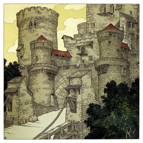 Curator: This ink and pen drawing before us, "Die Bucher Der Chronika Der Drei Schwestern 3," dates back to 1900 and is the work of Heinrich Lefler. Editor: Wow. The detail is almost obsessive! It's a riot of lines that somehow coheres into this believable medieval cityscape, teeming with life...or maybe turmoil? It's hard to tell if they're celebrating or fleeing. Curator: Indeed. Lefler was part of a turn-of-the-century artistic milieu interested in historical narrative. Notice how the density of detail is used to create a sense of authenticity, pulling from established iconography, particularly Germanic and Nordic mythology, prevalent within the broader art of the medieval era. The architecture, for instance, suggests an attempt to depict a 'real' medieval town, though one tinged with a certain romanticism. Editor: That romanticism definitely shines through! I can almost smell the wood smoke and feel the rough cobblestones underfoot. But it also strikes me as a bit claustrophobic. All those buildings pressing in, the crowds milling about...it feels almost oppressive, like a beautiful but gilded cage. There’s something both attractive and terrifying. Curator: That's a key aspect to the history of Lefler's imagery, that's exactly the feeling it must arouse to the contemporary German audience, it's supposed to be imposing and awe inspiring. The level of detail does suggest this almost fetishistic quality in its rendering. Editor: I think this perspective on audience really clicks. Like the best fairytales, I'm sure this one, with the Three Sisters, speaks on a number of levels. So are these knights headed somewhere important or going home? Curator: The tension is productive, since that kind of liminal space that holds the power to affect cultural meaning within history and that is where, I feel, a drawing like this is a compelling site of public and intellectual investigation. Editor: Absolutely, and there's nothing more interesting to me as an artist than feeling that moment between stories: that potential brimming inside. Thank you for giving the artwork this historic backdrop!