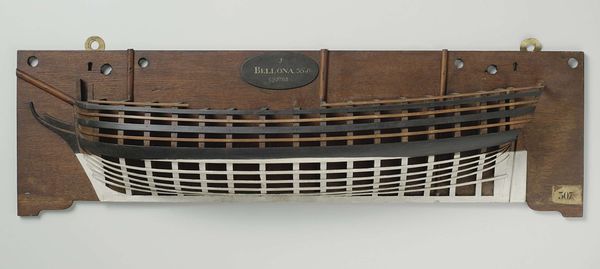 Curator: Well, look at this meticulously crafted wooden object, it is an 18th-century half model of an 18-Gun Brig. Editor: Immediately, the precision and sparseness create a palpable sense of restrained power, as though a full-bodied vessel has been elegantly compressed into a two-dimensional plane. Curator: These models, especially around 1795 when this one was made, often served as crucial design tools for shipbuilding. The plans wouldn't exist as architectural drawings as we understand them, but from these physical objects a ship was effectively reverse-engineered, each plank shaped and laid to create the overall hull. Editor: You know, seeing it as a functional object that guided the work on real boats gives another layer of depth to the piece. This repetition of parallel shapes really underscores its formal rigor, right? A fascinating study of line and the curvature of the hull—the artist emphasizes both verticality and horizontal extension within a limited space, the structure almost breathing outward... Curator: Absolutely! What I find equally remarkable is the way it bridges the gap between pure design and the burgeoning naval power of the era. This seemingly simple object hints at the complex interplay of craftsmanship and geopolitical strategy, the cultural status associated with naval prowess… Editor: That context absolutely amplifies how the maker so deliberately used scale here to amplify feelings, the hull emerging towards you. Also, I'm struck by the contrasting tones – how they lend drama to the geometric design. It emphasizes clarity with stark dark over bright... almost a didactic impulse here. Curator: Perhaps a testament to the cultural role model shipwrights played? This object shows what happened when you have someone who builds ships, while being also a community leader. Editor: Perhaps… For me the simple form makes the mind more agile and imaginative, like visual thinking that gets unlocked... The whole experience comes as almost... ethereal. Curator: An apt description for a piece that in its own way once facilitated voyages that have long passed. Editor: I couldn't agree more. This has given me a greater insight.