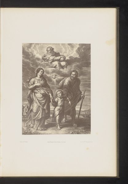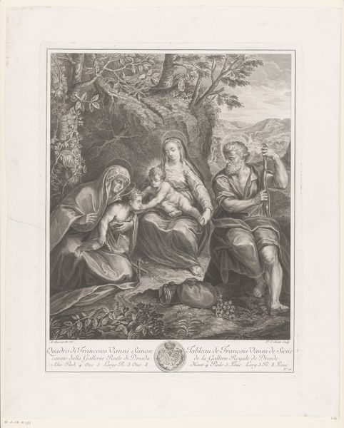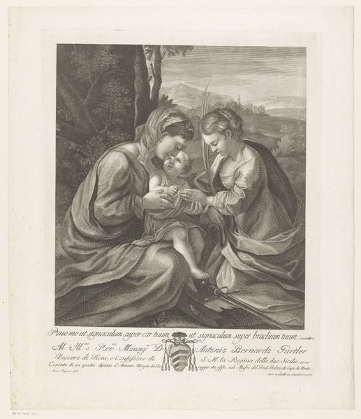 Francois de Poilly created this engraving of Maria and Elisabeth with their children, a scene brimming with understated yet powerful symbols. Halos encircle the heads of the holy figures, signifying divine status and spiritual illumination. This iconography is a direct descendant of Byzantine mosaics, where golden haloes similarly elevated sacred figures, setting them apart from the earthly realm. The motif transcends centuries, reappearing in Renaissance paintings and Baroque sculptures, each time reinforcing the subject's sanctity and connection to the divine. Interestingly, the halo's circular form mirrors the sun, an ancient symbol of life, rebirth, and cosmic order. The image taps into our collective memory, evoking a sense of reverence and awe. It’s a continuous thread linking our present to the deep-seated cultural and psychological need to visualize the sacred.