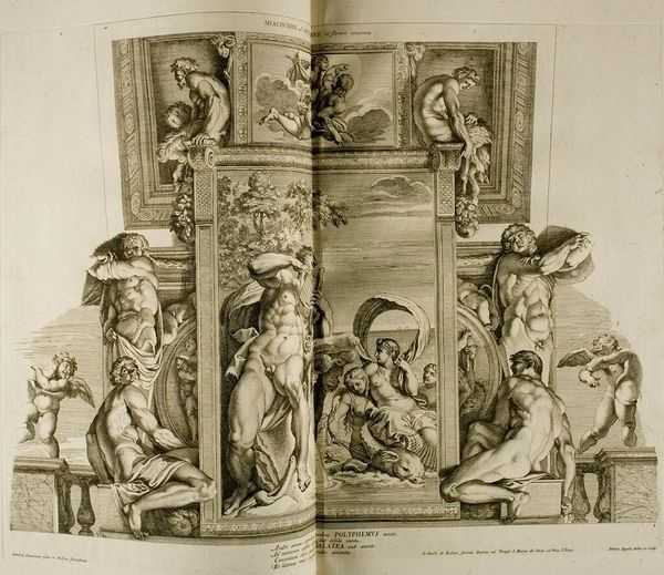 Curator: This is Pietro Aquila’s "Galeriae Farnesianae: Hero and Leander," created around 1690. It’s a complex engraving, isn’t it? Editor: Absolutely! It evokes a feeling of classical drama, almost operatic in scale, despite the small figures. The composition is so dense. Curator: Note how Aquila uses the framing devices to create distinct spatial planes and draws our eye across the page. The interplay of light and shadow is also remarkable. Editor: Yes, and the myth of Hero and Leander is so powerfully realized here. Leander's desperate swim towards the tower, a beacon of love. That beacon also represents hope amid despair, don't you think? Curator: It is a visual representation of yearning and the tragic consequences of unyielding desire. The engraving medium itself contributes to the graphic tension, doesn't it? Editor: Precisely, and seeing it now, I'm struck again by the enduring power of symbols to tell such potent stories. Curator: Indeed, and the enduring sophistication of Aquila's technique invites continual revisiting. Editor: A perfect example of how art can capture the eternal struggles of humanity.