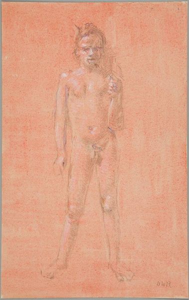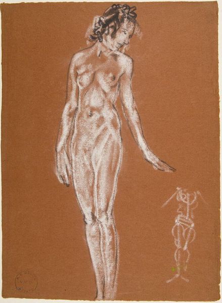 Curator: Edward Burne-Jones's "Study for King Cophetua and the Beggar Maid," presents an intriguing sketch done with chalk on paper. Editor: I am struck by how the rich, brown paper grounds the figure, while the chalk gives it an ethereal, almost dreamlike quality. Curator: This choice of materials and the medium's inherent qualities speaks to a Victorian interest in materiality and the labor of artistic creation. It moves away from the pretense of effortless genius, acknowledging the work involved. Editor: Absolutely. The sketch, itself, tells us so much about the relationship between the King and the Beggar Maid and we can easily draw contemporary parallels to gender, identity, and the ever-persistent power dynamics within society. Curator: It is fascinating how Burne-Jones uses simple materials to convey such complexity. Editor: Indeed, it makes you consider the socioeconomic implications present in art.