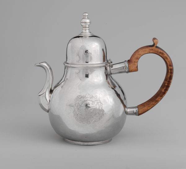 This teapot was created by Jesse Kip, around the turn of the 18th century. It combines a gleaming silver body with a warmly patinated wooden handle. The body of the teapot would have been raised from a flat sheet of silver, hammered and shaped with great skill over time. Notice the crisp lines of the spout and lid, and the way they contrast with the softer, bulbous form of the body. Silver like this was a precious material, signifying wealth and status. The labor-intensive process of silversmithing also added to its value. The wooden handle is a more humble material, but beautifully carved and fitted to the silver. The combination of these two materials speaks to a moment in history when handmade objects were still highly valued. The teapot is more than just a functional object; it's a testament to the skills of both the silversmith and the woodworker, and the social rituals around tea drinking in the period. It's a reminder that even everyday objects can be rich with cultural meaning.