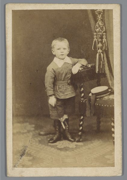 Curator: The melancholy emanating from this albumen print is quite potent, isn’t it? The portrait is of a young boy with a hoop, taken in 1898 by Michel Berthaud. Editor: It is! There's a sense of stillness, almost of entrapment. The muted tones emphasize a melancholic sentiment; even the child’s gaze feels heavy with a seriousness that belies his age. Curator: True. I find it difficult to know what to make of his gaze – it’s difficult to connect with him and find a lighthearted, playful quality in the image, though the toy suggests it ought to be there. Editor: Precisely! Considering the broader context of the late 19th century, childhood was idealized, but also subjected to rigorous standards and discipline. I wonder about the burden of expectations placed upon children of this era, the pressure to perform, to embody respectability. His stillness speaks to me of conformity. Curator: Do you think it’s a form of defiance, then? I wonder if the boy's sombre appearance isn't only an expectation, but rather a genuine representation of him in that time? Maybe that was a happy time! Editor: Or maybe neither is true! We must allow for nuance! I find myself curious about what happens beyond the frame. Is the boy performing adulthood, or simply biding his time until childhood play? Considering Berthaud's probable background in commercial photography, it's important to reflect on how societal pressures shape identity. The subject must hold some of those considerations, regardless of whether the little boy likes it or not. Curator: You always drag me back into the socio-political currents! And yes, here, that context adds some serious weight. Still, as a creative, I wonder whether the magic lies more in Berthaud capturing some unknowable truth, however weighty. The photo somehow embodies the complexity, don't you think? Editor: Absolutely. A beautiful convergence of art, social context, and a fleeting moment of boyhood... laden with the expectations of time, perhaps. Curator: Perhaps. I think this conversation will give me more to ponder next time I find myself spinning my hoop. Thanks for that! Editor: Always! This piece has nudged me to interrogate historical frameworks... something I'm perpetually thankful for!