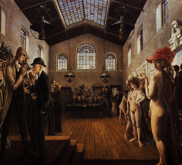 Editor: This oil painting, "Monks in the Certosa in Padua," was completed around 1850 by Vincenzo Abbati. The scene, dominated by browns and greys, feels still, quiet, almost claustrophobic. What strikes you most about its composition? Curator: Note how the architectonic rigor of the Certosa, its arches and linear pews, orders the space, yet the painter introduces subtle variations within that order. Observe, for example, the varied postures of the monks; the light modulating across their habits; the way the architecture seems to flatten the scene into a study of browns. Editor: Yes, the subdued palette definitely flattens the space. And the perspective, while seemingly accurate, adds to the feeling of constraint. Can you say more about how the structure contributes to the artwork? Curator: The repetitive lines and geometric forms of the architecture function almost like a grid. Against this rigid structure, Abbati places the figures, each subtly different. It is the tension between the abstract architectural grid and the representational treatment of the figures that generates visual interest. Note the central lectern; a symbolic nexus but also, in compositional terms, a device to pull your eye deep into the scene. Editor: I hadn't considered the lectern in that way. The way it is illuminated helps with that depth, I suppose. The balance is unexpected. Curator: Precisely. And further consider the handling of light. It is not used to create drama, as in Baroque painting, but rather to subtly reveal the forms and textures within this controlled environment. Did Abbati aim to celebrate a religious space, or examine painting itself through careful distribution of colour and volume? Editor: I initially saw a sombre scene, but your analysis shifts my perception to a sophisticated study of form. Curator: The painting invites you to move beyond surface representations and look at formal relationships between the components of an image.