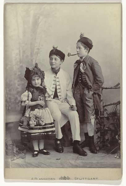 Curator: This historical photograph, possibly from 1899, is titled "Groepsportret van Willy Moos met pijp in zijn mond, Else Wachenheimer-Moos met pop in haar armen en Arthur Moos met pijp in zijn hand als kinderen in zuid-Duitse klederdracht, tijdens carnaval". The portrait captures the Moos children in Southern German traditional dress, likely during a carnival celebration. Editor: The immediate impression is… unsettling. There’s a precociousness to these children, a forced adultness in their clothing and props that feels decidedly strange through a modern lens. Curator: Indeed. Consider the pipes, miniature versions of adult affectations. What significance do they hold beyond mere costume? Carnival, after all, is about inverting norms, about brief sanctioned chaos. These children aren’t just dressed up; they are actively embodying an adult, masculine persona. Editor: Which takes on a sharp edge when we consider the wider societal context. Imperial Germany at the turn of the century was wrestling with identity, grappling with anxieties about modernity and tradition. The children in their "klederdracht" are being staged in a scene of invented folk culture, acting out the roles of the rooted Heimat against an urbanizing landscape. Curator: And the symbols become layered. The folk costume itself speaks of regional identity. It might be worth investigating precisely which region in southern Germany the clothing represents, to connect it to the family's origin or chosen symbolic home. Editor: The little girl clutching a doll feels the most poignant, an innocent entangled within performative traditions. Her tight grip suggests a desire for connection amidst a rigid staged reality. This highlights the intersectional space childhood occupies – innocence confronted with social performance and tradition. Curator: I’m intrigued by how they seem frozen. The clothing does provide them an avenue for expression but it looks limited by the strict pose. It also strikes me how portrait photography, particularly family portraits, has evolved into a different method for recording intimate personal moments. Editor: It's the uncanny blend of cultural symbolism, performative identity, and unsettling power dynamics embedded within this image. I think this photo reveals how constructs of nation, region, and family converge to create compelling, yet often complicated narratives around identity. Curator: Indeed. Looking through a psychological lens provides some important insight, adding another dimension to how families communicate through symbolism. The way the children use props, mimic behaviour and mirror clothing shows there is emotional weight in all of these images. Editor: Yes. Analyzing old photographs offers critical space for rethinking our approach to gender, performance, and heritage, reminding us of the continuous processes of constructing the very frameworks we still use today.