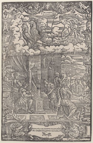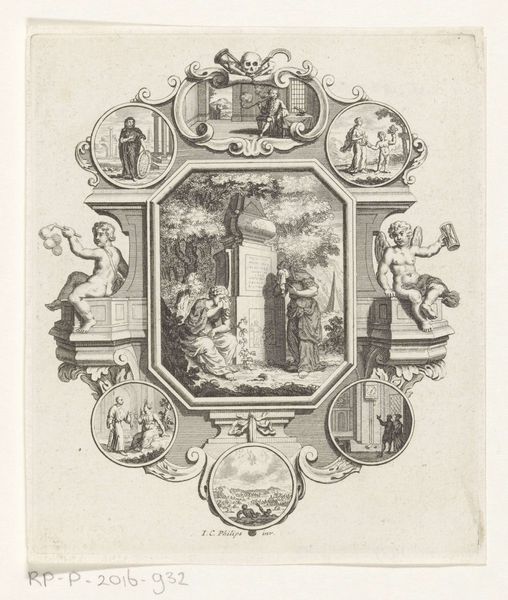 Curator: This engraving, "Initial H with the Annunciation to the Shepherds," was created by Hermanus Numan, sometime between 1754 and 1825. It resides here at the Rijksmuseum, a small but intricate print. Editor: The first thing that strikes me is how delicately the scenes are rendered within the strong, bold shape of the letter "H." It feels like a world contained, doesn't it? Curator: Exactly. The initial is more than decorative; it provides the structural framework for a theological narrative. See how the upper portion illustrates the heavenly host appearing to the shepherds depicted below? Editor: The Annunciation. And Numan anchors it further by including scenes that frame both sides of the letter, one to our left looking more wild, one on the right seeming like they are protecting or guarding a camp. In that period, what did this kind of visual encapsulation communicate? Curator: The 'H' perhaps signifying hope, held within boundaries, and bestowed from above. The engraver utilizes a crisp, clean line, typical of engravings, but there’s also a surprising amount of expressive detail crammed in—especially if you zoom way in and look closely. Editor: I'm drawn to the body language of the shepherds; how they flail, react, and hold their arms up as if blinded. A really astute capture of power dynamics, both earthly and divine. Their reaction says much about societal structure—how a divine message might appear as overwhelming or incomprehensible to the working classes. How it challenges ideas around revelation being neutral. Curator: I like how you are connecting revelation to reception. The execution, using only lines to define shape and texture, amplifies this sense of revelation emerging from the darkness. Look at those swirling clouds. Almost like the very medium echoes the message. Editor: This wasn't just religious iconography, it's art embedded with the social and class anxieties of its time. Considering the rise of Enlightenment thinking, it suggests a negotiation— or maybe a tension between traditional beliefs and newer perspectives. Curator: An 'H' for Holding, for Hope… maybe even History itself in its constant state of revealing, if we just remember to really look. Editor: A beautiful articulation. Perhaps, even 'H' for holding space for a challenging dialogue of faith and class and history that’s still resonating centuries later.