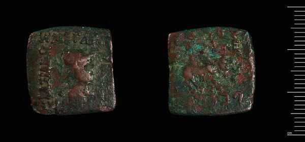 Curator: At first glance, this coin by Apollodotos I looks like a worn, brown, unremarkable tile. Editor: Actually, its unassuming appearance is precisely what draws me in. What narratives of trade, power, and cultural exchange are embedded in such a small object? Curator: Indeed. The coin offers a window into the history of the Indo-Greek kingdom. Its materiality and design reflect the political climate of the time. Consider the impact and implications of economic systems on shaping social hierarchies. Editor: Right, and the coin's existence also speaks to the socio-political forces at play, including the legacy of colonial structures and the impact on marginalized communities in our own contemporary moment. Curator: Ultimately, objects like these invite us to reflect on our own relationship to commerce and value, especially in a world still grappling with the weight of empires. Editor: Looking at it, I am reminded of how objects, even seemingly minor ones, can embody complex histories.